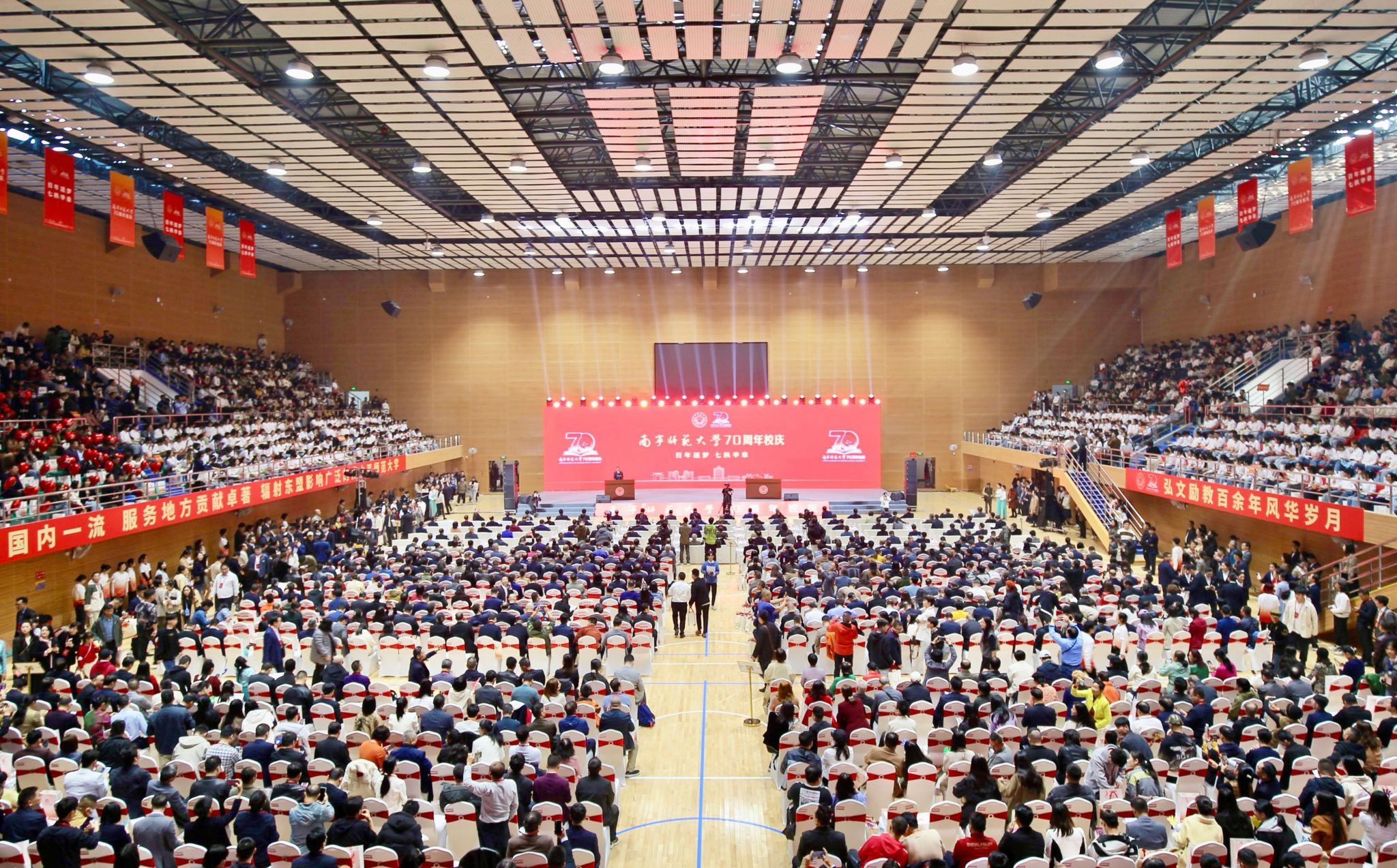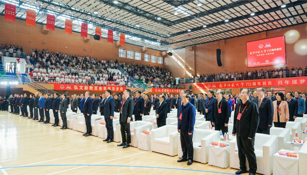 李丰生书记在主持讲话中表示,七秩春秋风雨兼程育英才,百年树人继往开来谱新篇。今天的庆祝大会翻开了学校发展历史的崭新一页。站在新的起点上,学校将继续以习近平新时代中国特色社会主义思想为指引,全面贯彻落实自治区党委、政府决策部署,为奋力谱写中国式现代化广西篇章、全面建设社会主义现代化国家贡献南师人的智慧和力量!
