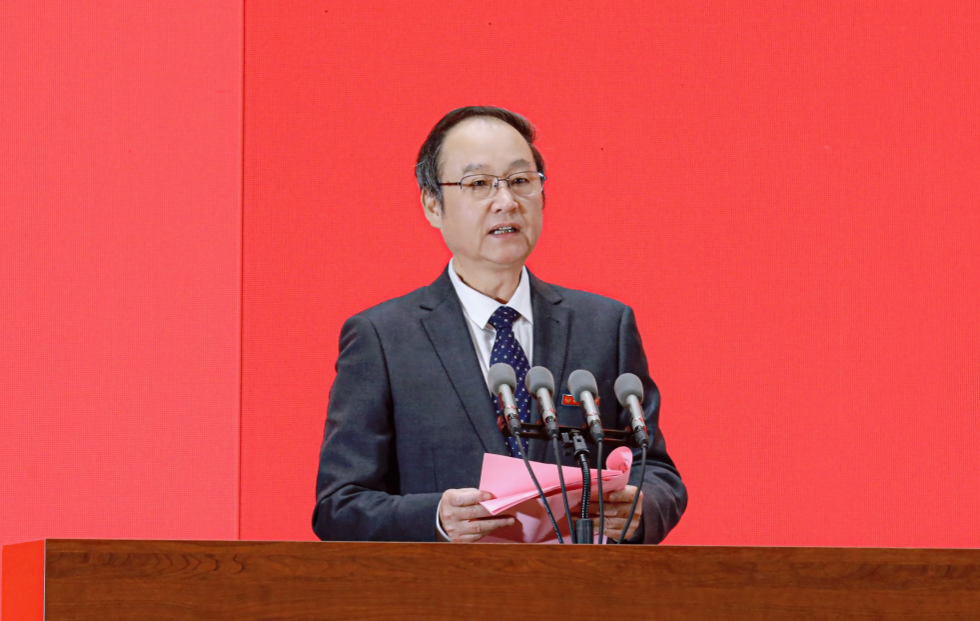 ▲自治区党委原政法委书记、自治区政协原副主席、学校校友温卡华出席大会