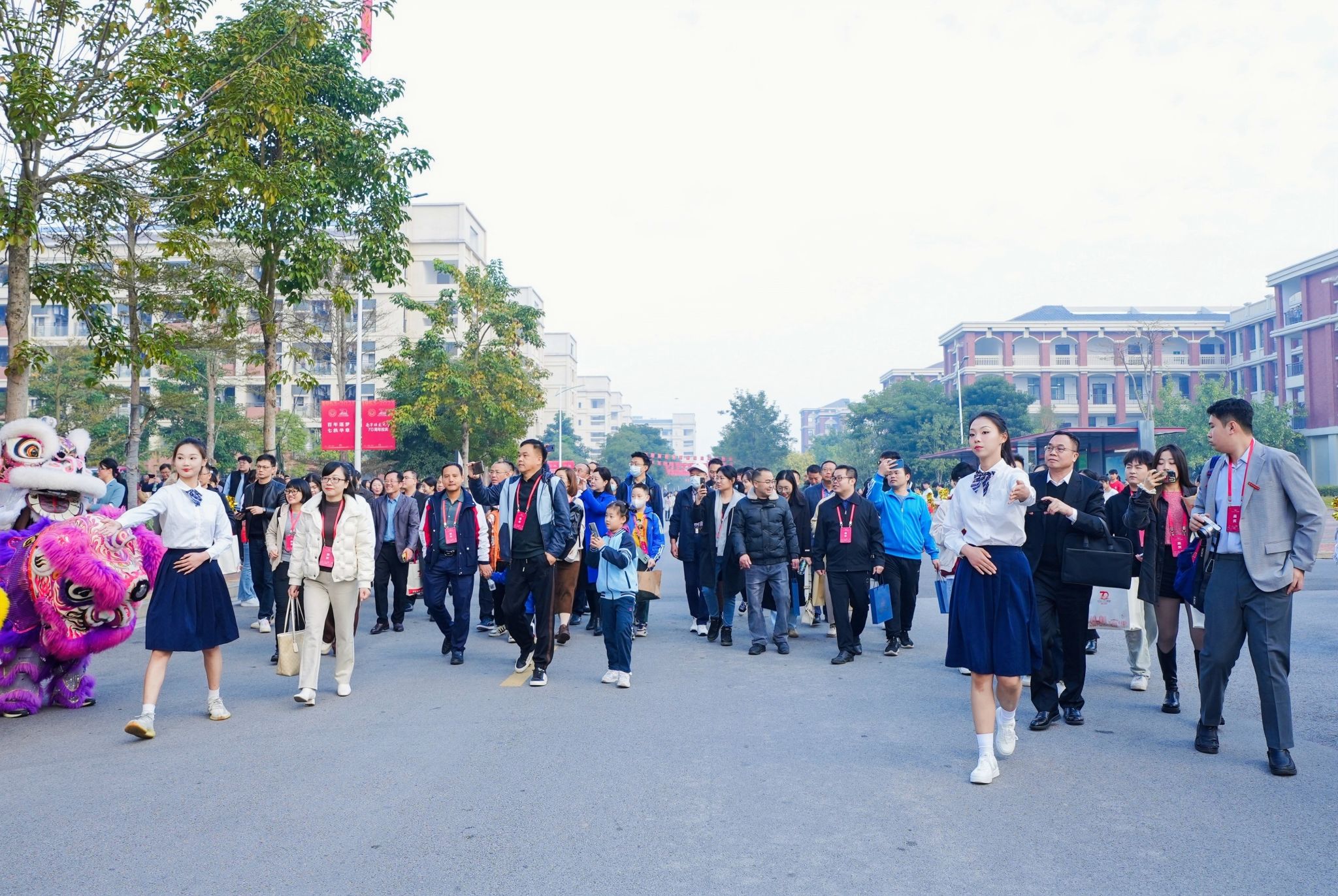 七秩扬帆展芳华,砥砺奋进谱新篇。庆祝大会开始前,学校精心准备了别开生面的迎宾式。同学们身着节日盛装,吹奏热情的迎宾曲,舞起欢腾的雄狮,跳着欢快的舞蹈,手持缤纷的花球,迎接领导和嘉宾们入场。 校园里,一簇簇鲜花,一个个精美的打卡景点和校庆景观,把师生和校友们的笑脸映衬得更加灿烂。在校庆典礼暖场活动中,播放了社会各界祝贺视频,表演了青春动感的歌舞《我的未来式》,校友为校庆原创的歌曲《微光致远》、《旷野方塘》、《未来有光》以及师生献唱的《再一次出发》、《天下》等。青春十足的气息,温暖优美的音乐,热忱美好的祝福,一阵阵此起彼伏的掌声,一张张欢乐的面孔,表达着对学校生日的喜悦和祝福。