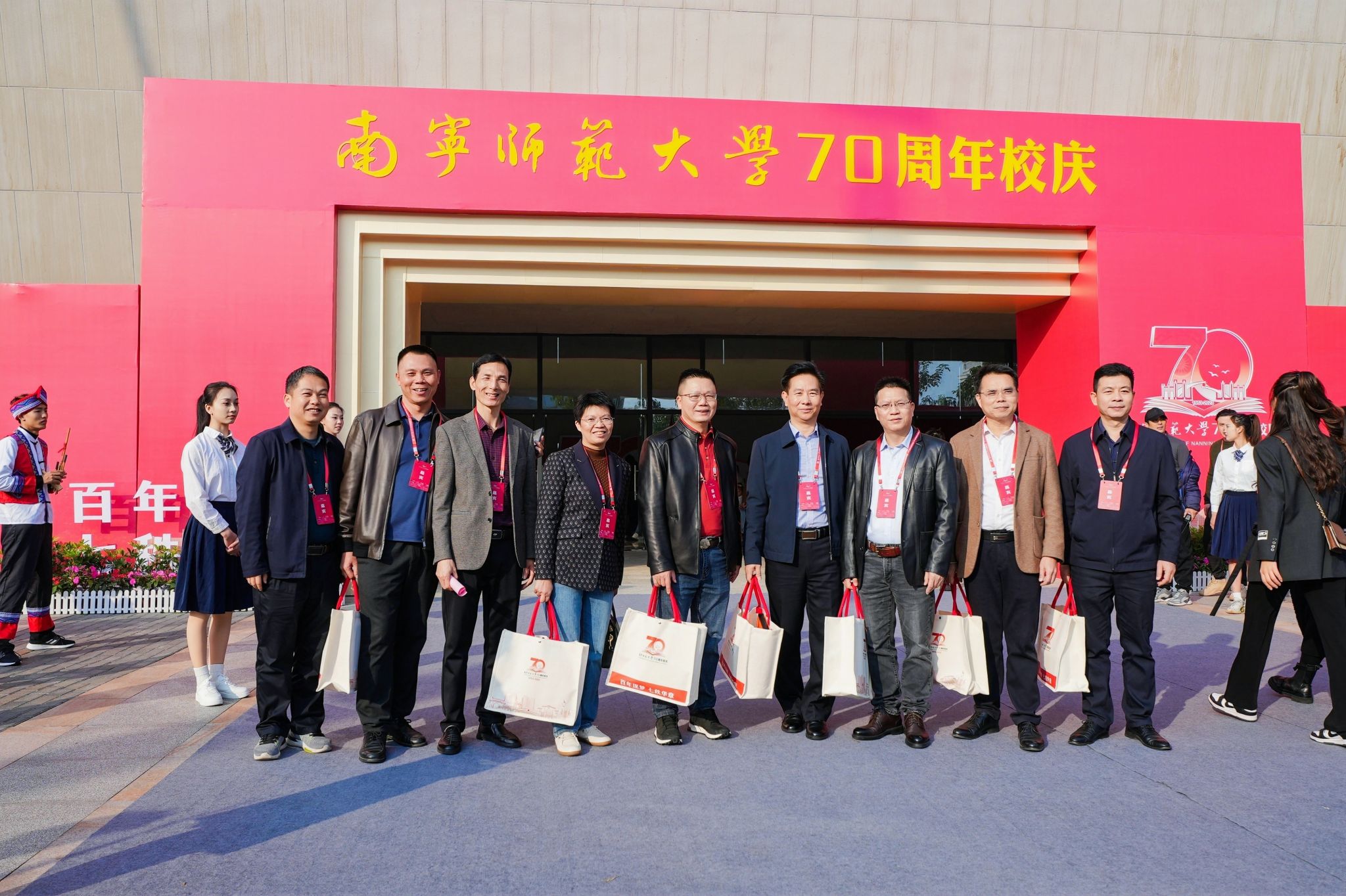 自治区人大常委会副主任、学校校友刘有明,自治区副主席李常官,自治区党委原政法委书记、自治区政协原副主席、学校校友温卡华,自治区人大常委会原副主任、学校校友莫永清,中国科学院院士王秋良,自治区人民政府副秘书长梁磊,自治区教育厅厅长刘友谊,自治区党委宣传部等有关区直部门领导,南宁市等地市领导,陕西师范大学、广西大学等区内外80余所高校负责人出席本次大会。此外,有关区县及其教育局领导,合作单位代表,社会各界来宾,媒体朋友,学校现任校领导、老领导、师生代表、校友代表等。