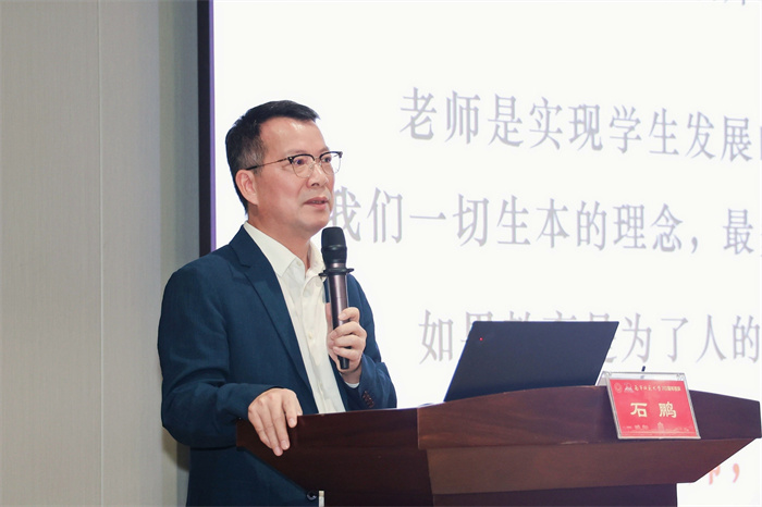 ▲南宁市第十四中学教育集团党委书记石鹏作题为《做教师成长的守望者》的主旨报告