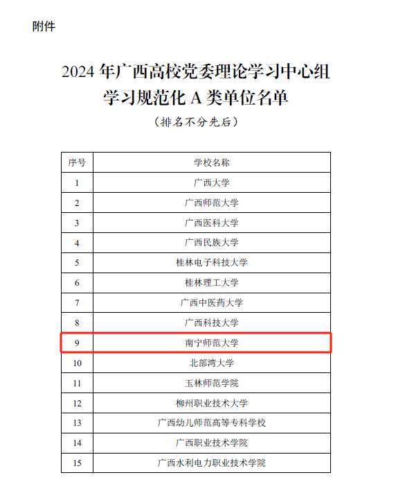 近日,自治区党委教育工委办公室公布了2024年广西高校党委理论学习中心组学习规范化A类单位名单,共评选出15所高校,best365官网位列其中。