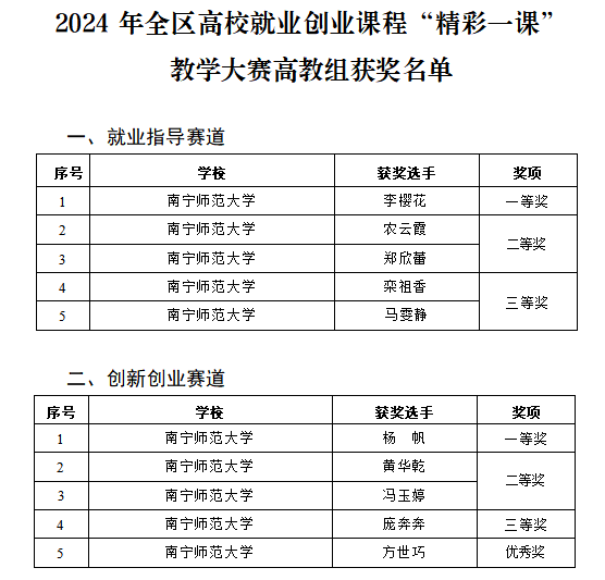 近日,自治区教育厅公布了2024年全区高校就业创业课程“精彩一课”教学大赛获奖名单,best365官网推荐的10名参赛教师全部获奖,学校荣获大赛优秀组织奖,其中获得一等奖2项,二等奖4项,三等奖3项,优秀奖1项,获奖总数排名全区高校第一,一等奖数量排全区第三。