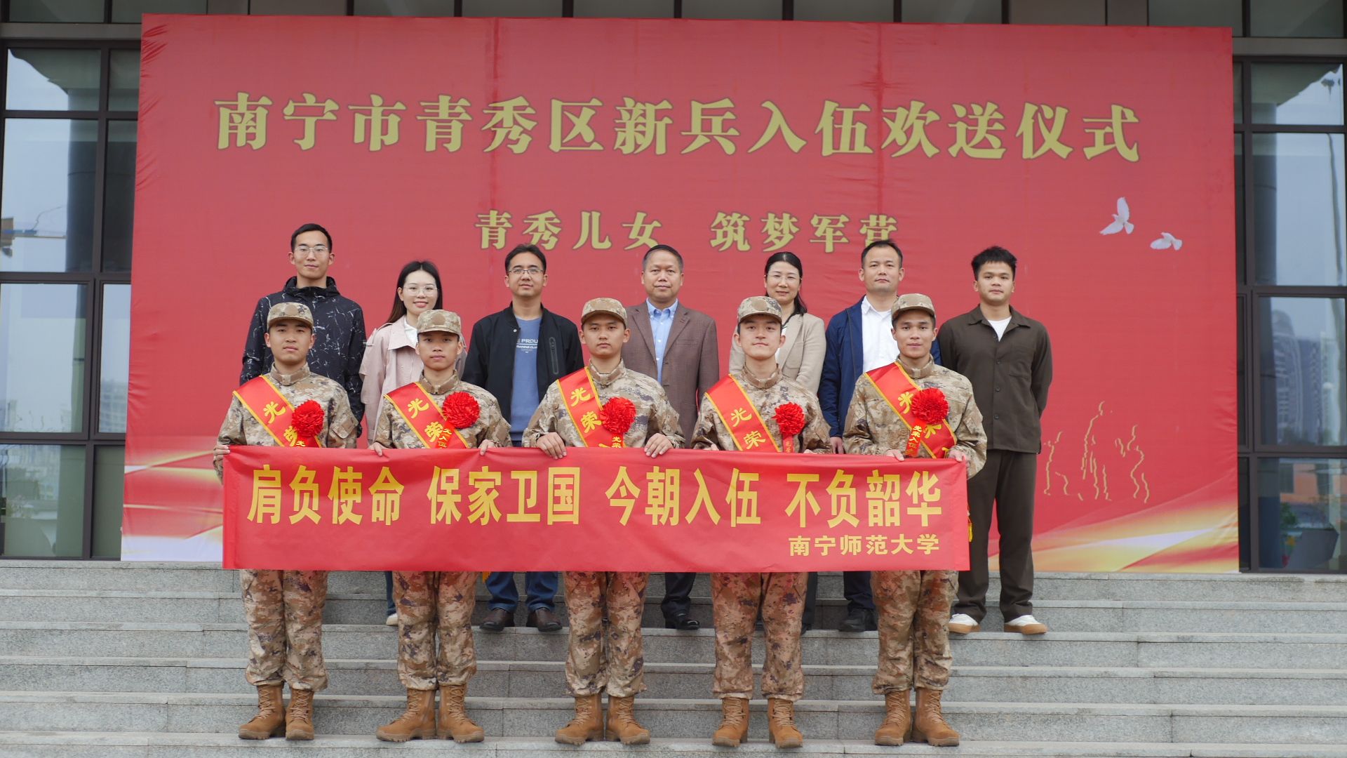 青春热血铸军魂,壮志豪情踏征程。3月13日上午,南宁市青秀区武装部举行了2025年春季新兵欢送会,青秀区区长黄立基、青秀区武装部主要负责人以及片区高校武装部负责人参加了欢送会。本次欢送会best365官网共有5名2025届毕业生应征入伍,best365官网武装部及相关学院负责人参加了本次新兵欢送会。