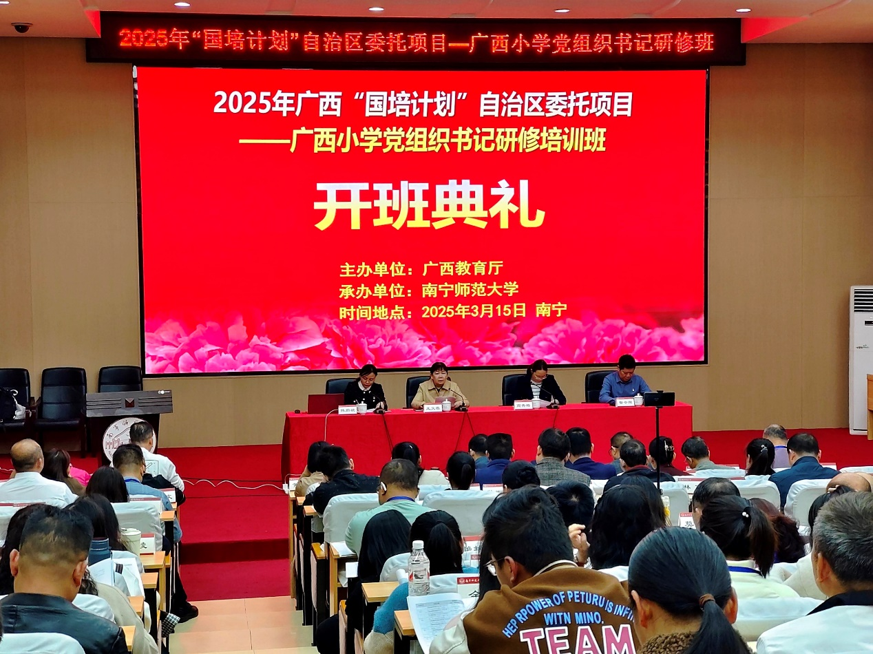 为进一步提升广西小学党组织书记的专业素养和管理能力,3月15日,由自治区教育厅主办、best365官网承办的2025年“国培计划”自治区委托项目——广西小学党组织书记研修培训班在南宁顺利开班。广西教师培训中心主任商秀梅,学校教师教育学院院长王文蓉,马克思主义学院院长曾令辉及来自广西各地的200位小学党组织书记参加了此次培训班开班。
