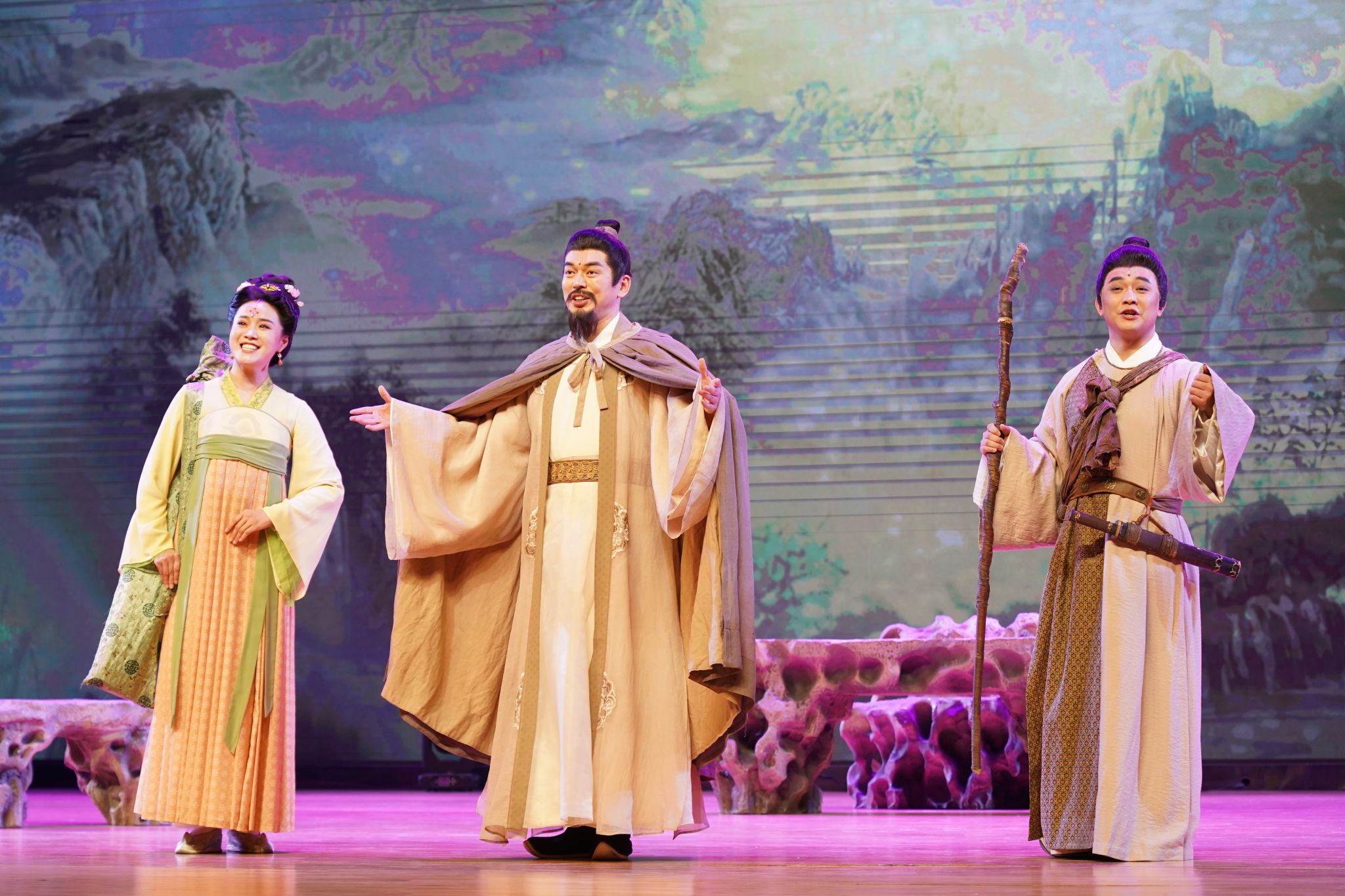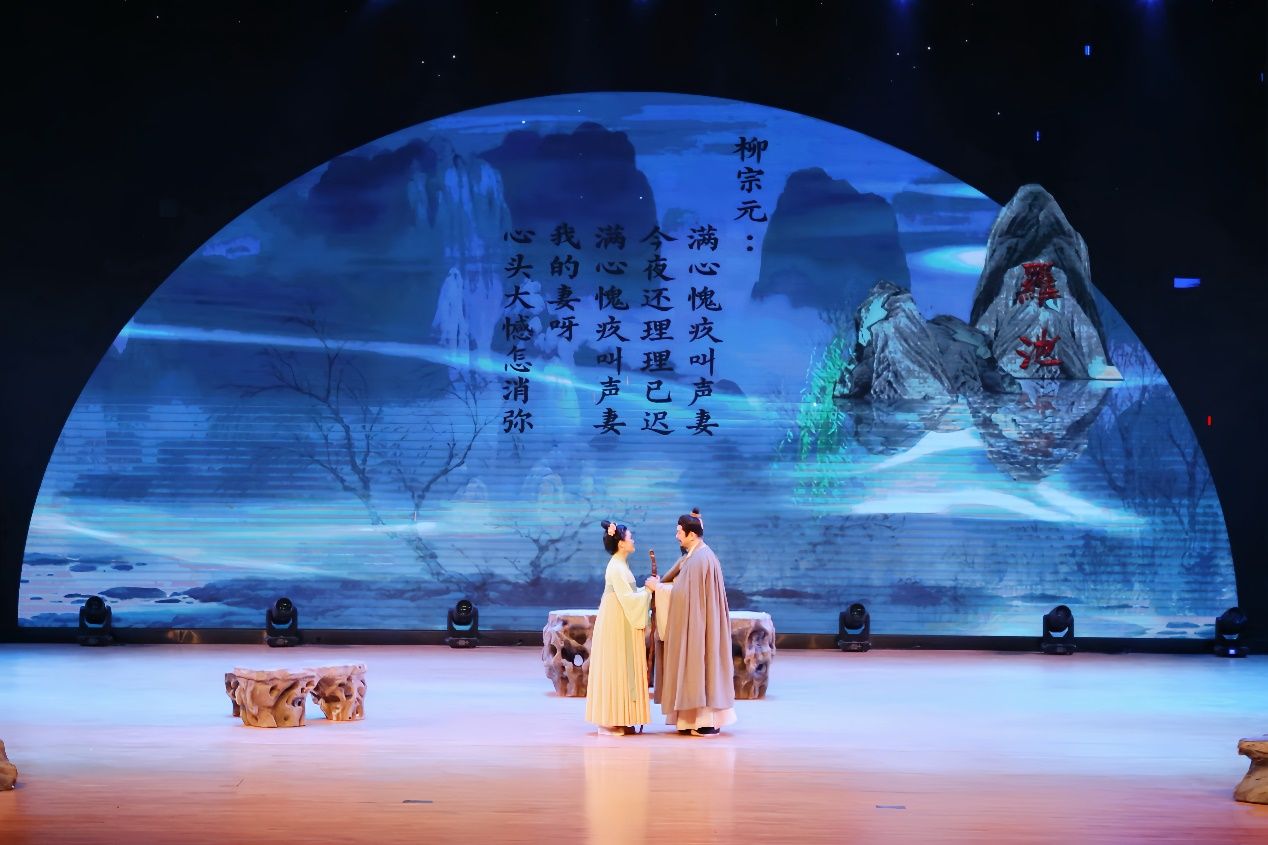 民族歌剧《柳柳州》聚焦一代宗师柳宗元在柳州度过的人生岁月,虽屡遭贬谪仕途失意,却初心不改情系苍生,坚信“官为民役”、坚持“利安元元”,实现了从“北望长安梦未休”到“我的长安是柳州”的艰难跨越和情感升华。极具张力的戏剧表达和精美的舞台布景使观众仿佛身临其境,而柳宗元的家国情怀更是通过演员们的倾情演绎直抵人心,深深打动了在场的师生。演出到精彩之处时,台下观众掌声如潮。