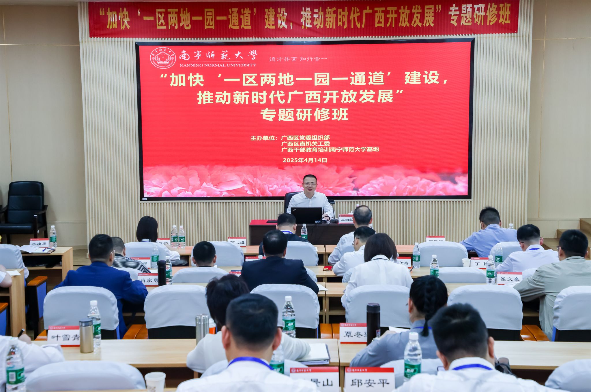 为深入学习贯彻习近平总书记关于对外开放的重要论述,助力广西打造国内国际双循环重要节点枢纽,4月14日,由自治区党委组织部、自治区党委区直机关工委、广西干部教育培训best365足球官网基地主办的“加快‘一区两地一园一通道’建设,推动新时代广西开放发展”专题研修班在best365官网明秀校区顺利开班。学校副校长王国红出席开班仪式并作导学报告。来自区直单位、中直驻桂单位,设区市商务、投促、外事等部门和产业园区、市属企业,以及县区的46名处级干部参加研修。
