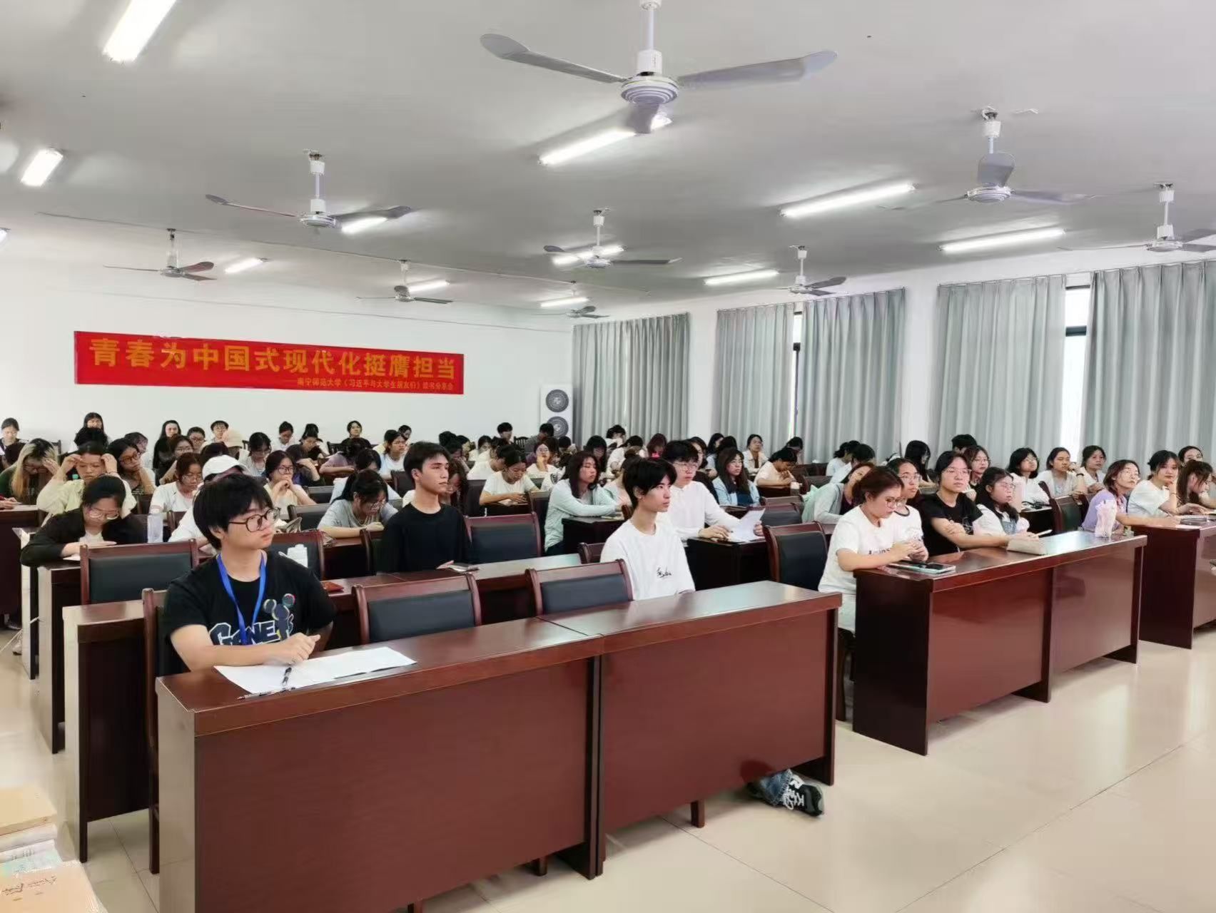 在分组讨论环节,同学们结合自身的学习和生活实际,积极交流阅读心得。有同学结合《论党的青年工作》中关于青年的论述,认识到新时代的中国青年要德智体美劳全面发展,要励志勤学、加强磨炼,要爱国、励志、求真、力行,听党话、跟党走,自觉践行社会主义核心价值观,努力成长为堪当民族复兴重任的时代新人,不断书写奉献青春的时代篇章。有同学表示,通过研读法治类书籍,更加理解了法治不仅是制度规范,更是一种生活方式。讨论现场气氛热烈,同学们在思想碰撞中深化了对青年使命的认识。