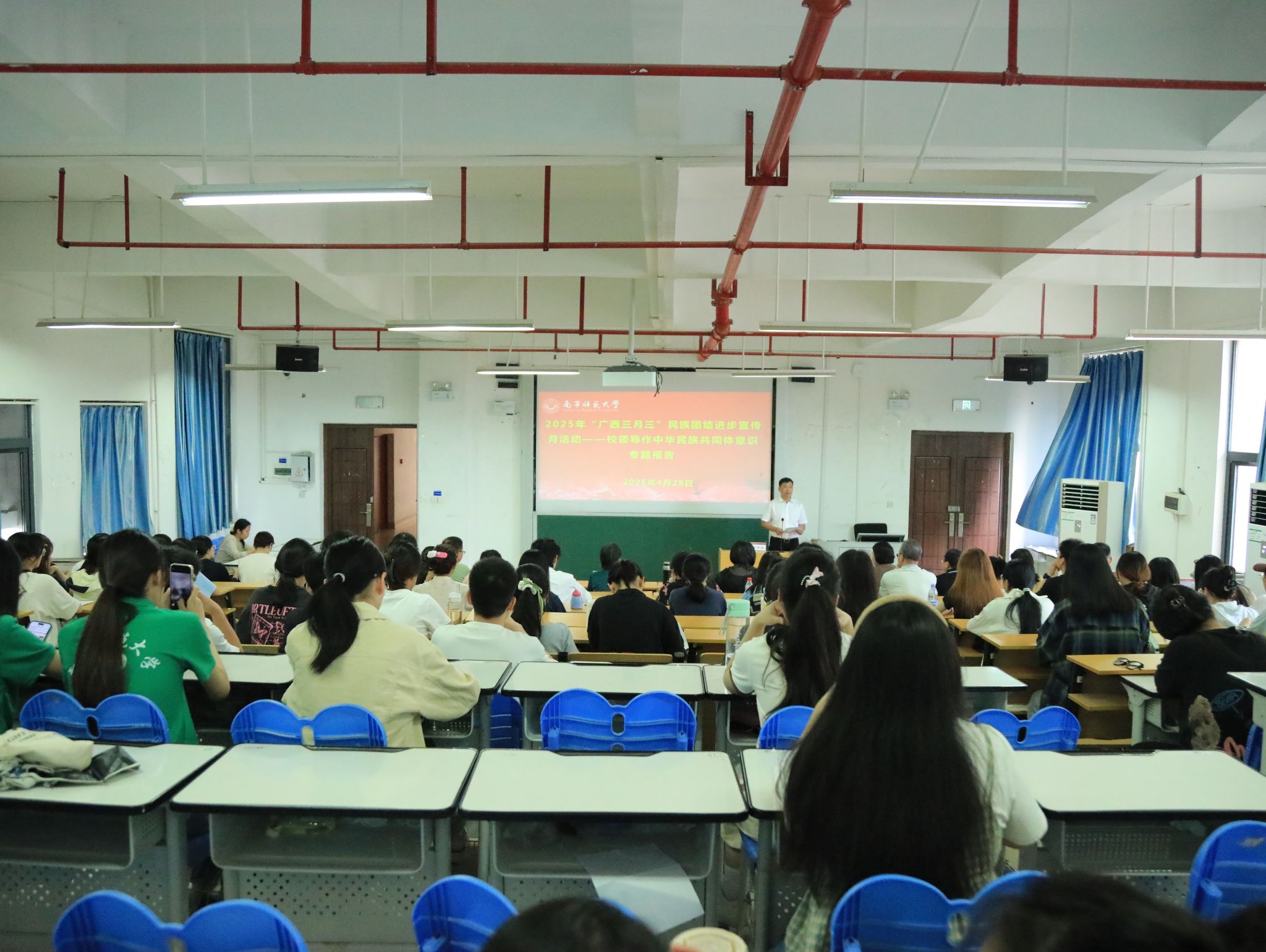 为深入贯彻落实国家及自治区关于加强民族团结教育的工作要求,4月28日下午,best365官网在五合校区举行铸牢中华民族共同体意识专题报告会。学校纪委书记李美清以《在八桂大地上谱写铸牢中华民族共同体意识的新篇章》为题作专题辅导。学校党委统战部部长、党办校办主任陈洪波主持报告会。