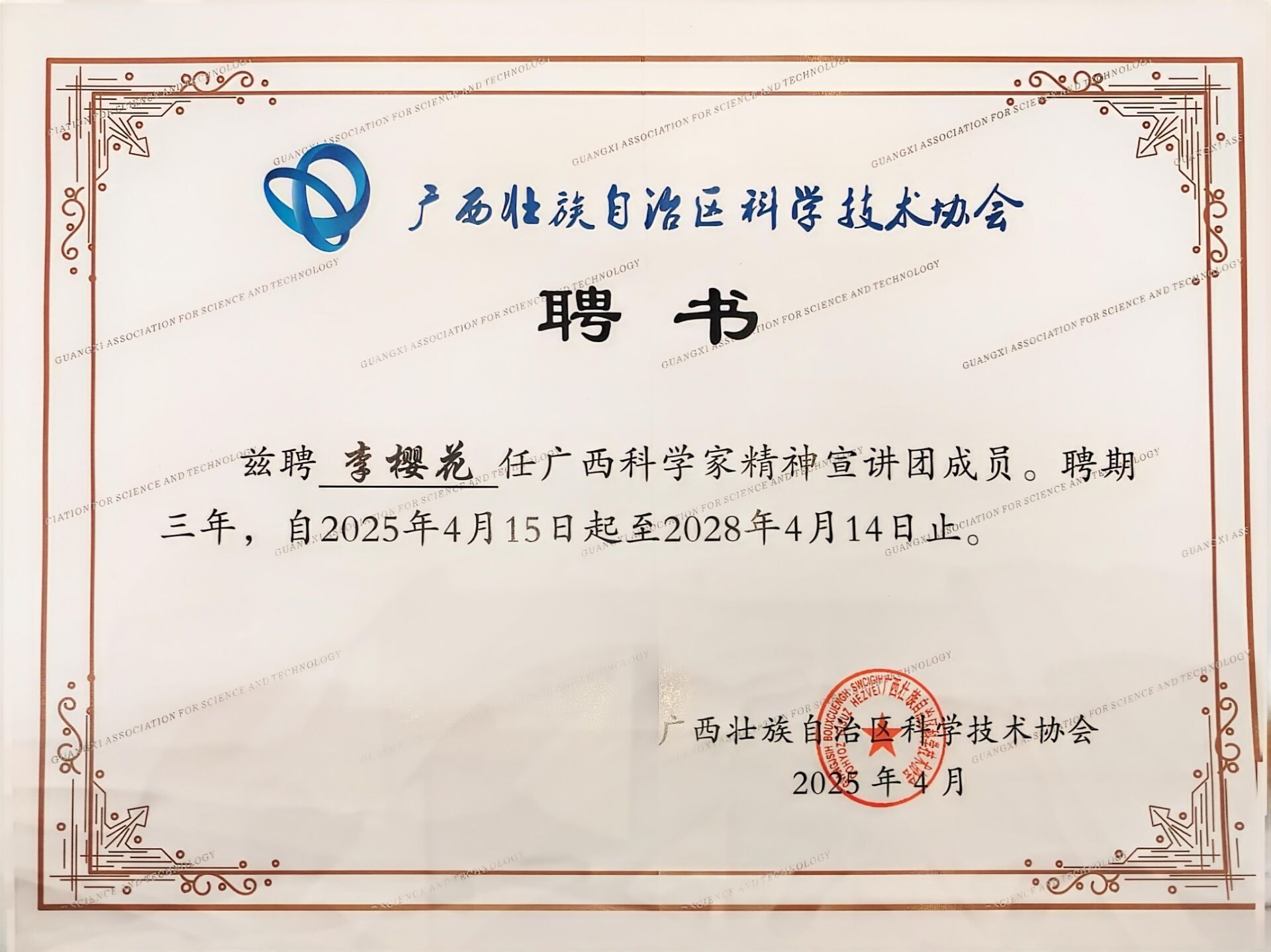 近日,自治区科协公布了第三批广西科学家精神宣讲团成员,best365官网新闻与传播学院团委书记李樱花入选。