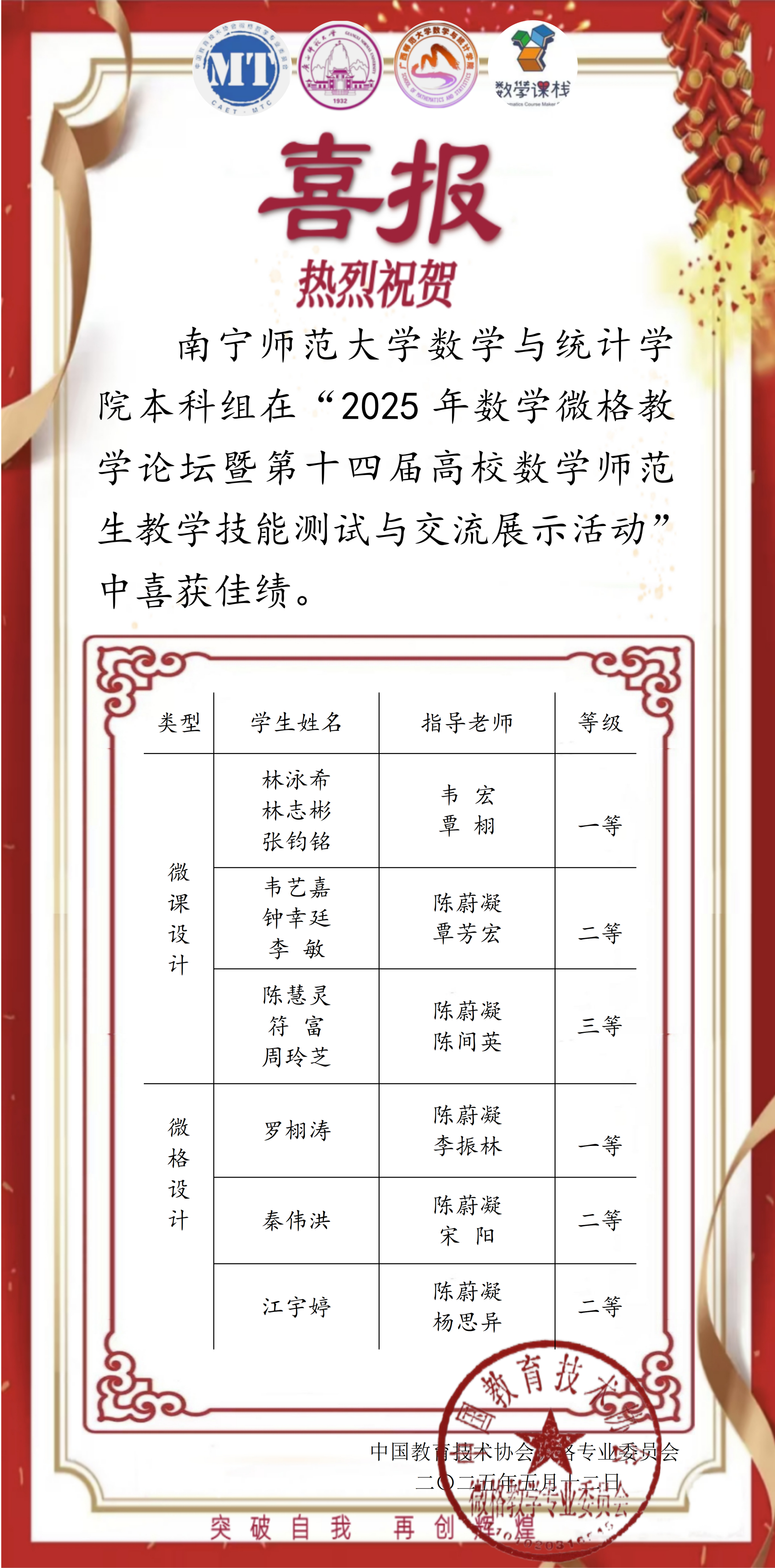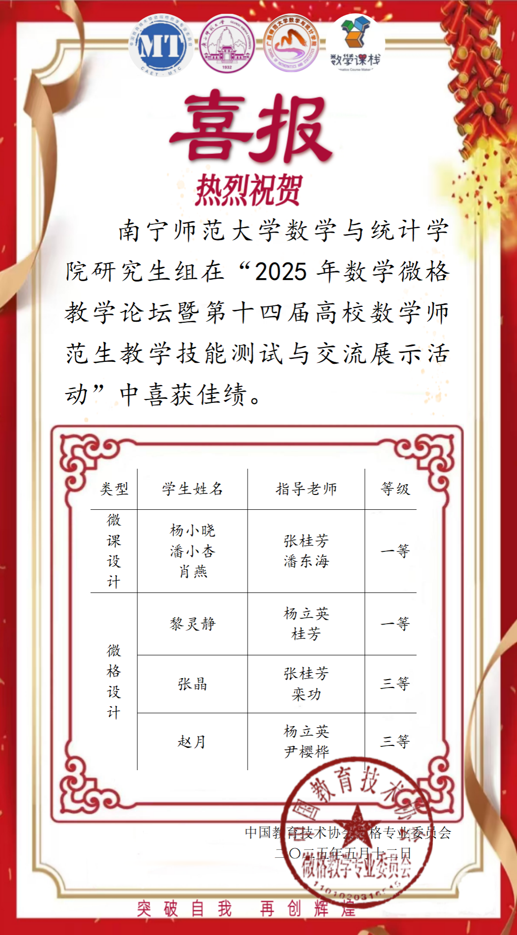 为全面贯彻落实《教育强国建设规划纲要(2024-2035年)》,推动人工智能技术与基础教育的深度整合,2025年数学微格教学论坛及第十四届高校数学师范生教学技能测试与交流展示活动于2025年5月9日至12日在广西师范大学育才校区顺利举办。比赛分为研究生、本科生两个赛道。best365官网数学与统计学院学子在比赛中表现优异,参赛作品及选手全部获奖。其中,6名参加微格教学测试的选手分别获得一等奖、二等奖、三等奖各2项;4名参加数学微课比赛的作品分别获得一等奖2项,二等奖1项,三等奖1项;best365官网被评为优秀组织单位。