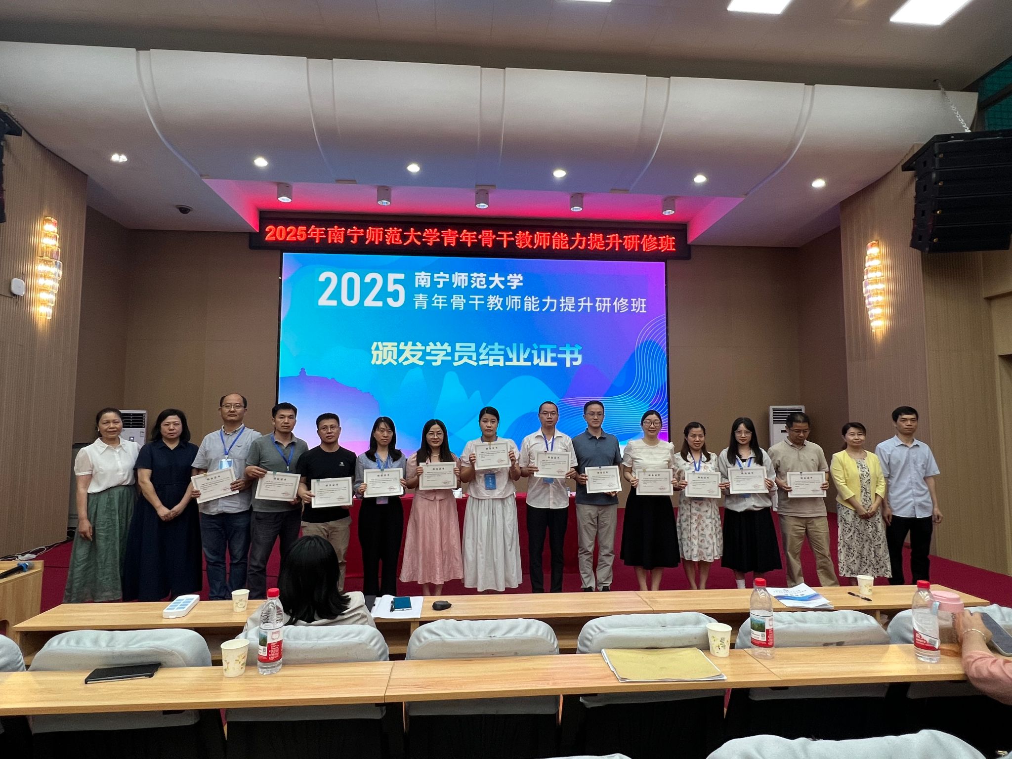 结班仪式上,广西高等学校师资培训中心、学校教务处、教育评价与教师发展中心共同为优秀学员及参训学员代表分别颁发了荣誉证书和结业证书。本期青年骨干教师能力提升研修班为青年教师拓展了教育教学和学术视野,促进了青年骨干教师在教学、科研与育人方面的综合能力提升。