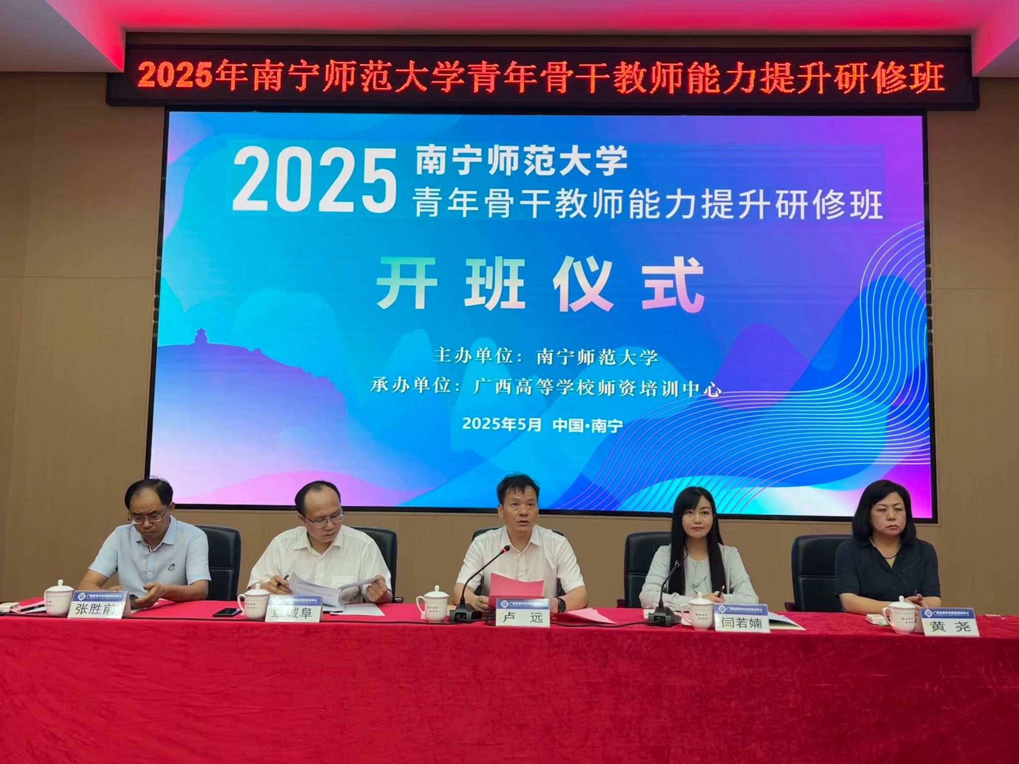 5月14日下午,学校副校长卢远出席了开班仪式并致辞,广西高等学校师资培训中心副主任闫若婻,教务处、教育评价与教师发展中心负责人,以及来自各学院100余名青年骨干教师参加了开班仪式。开班仪式由广西高等学校师资培训中心副主任闫若婻主持。卢远在致辞中指出,举办本次研修班是贯彻落实全国、全区教育大会精神的重要举措,也是加强学校教师队伍建设、实施教师教育能力提升工程的现实需要。他对参训教师提出三点要求:一要端正学习态度,树立良好学风;二要坚持学有所用,做到教学相长;三要严肃培训纪律,服从研修安排。