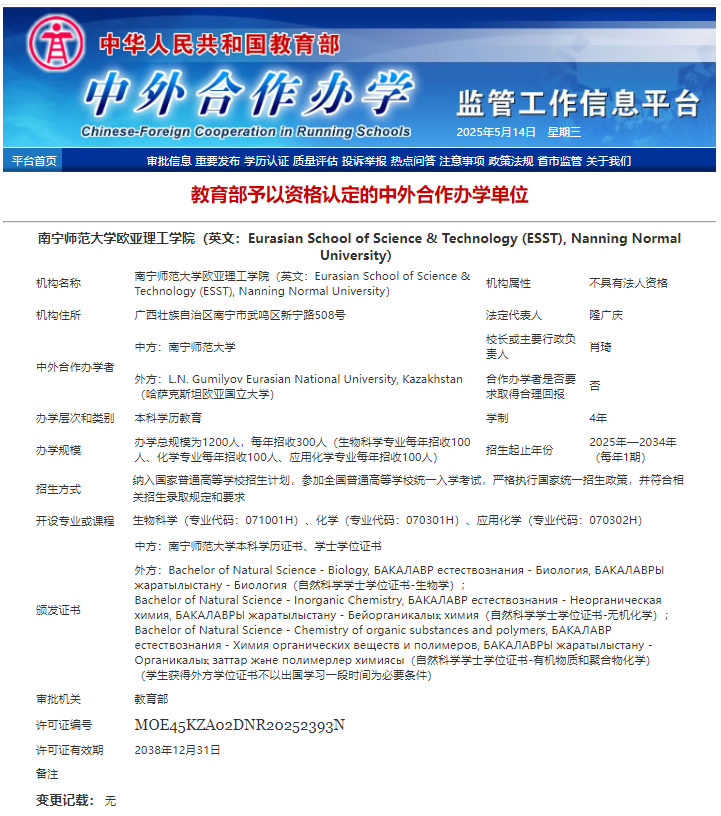 申报以来,在学校党委行政的领导下,国际交流合作处统筹协调教务处、化学与材料学院、环境与生命科学学院等单位,以高度的责任感和使命感,凝心聚力、集中攻关,实现best365官网中外合作办学机构从“0”到“1”的历史性突破。该机构的获批,标志着best365官网国际化办学迈上新台阶,best365官网形成了“以中外合作办学机构为引领、中外合作办学项目为支撑”的多元化、立体式中外联合培养体系,国际化人才培养展开了新篇章。未来,学校将以欧亚理工学院为平台,进一步深化与哈萨克斯坦的教育交流与科研合作,为广西打造面向东盟的教育开放合作高地,构建“一带一路”教育共同体作出积极贡献。