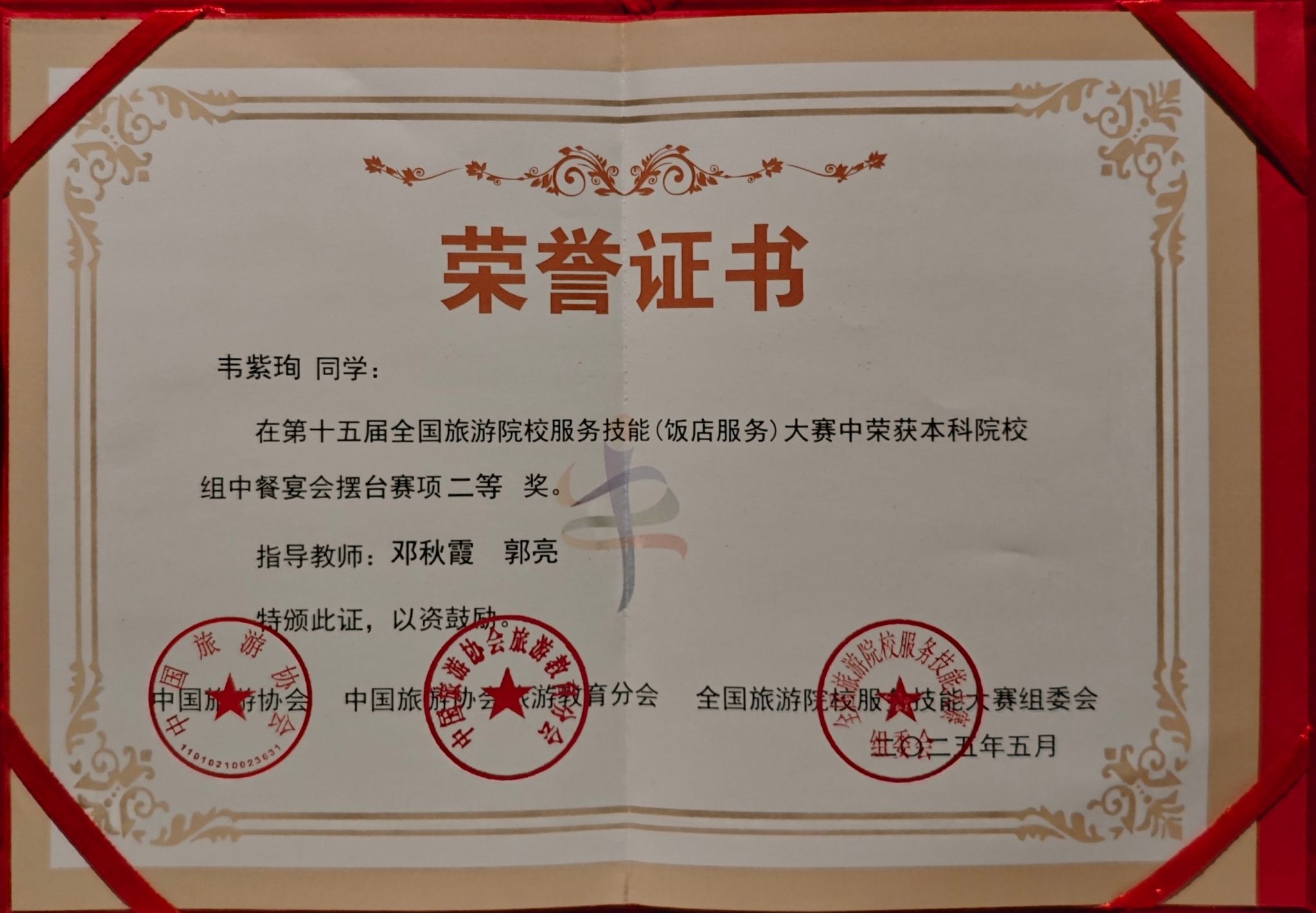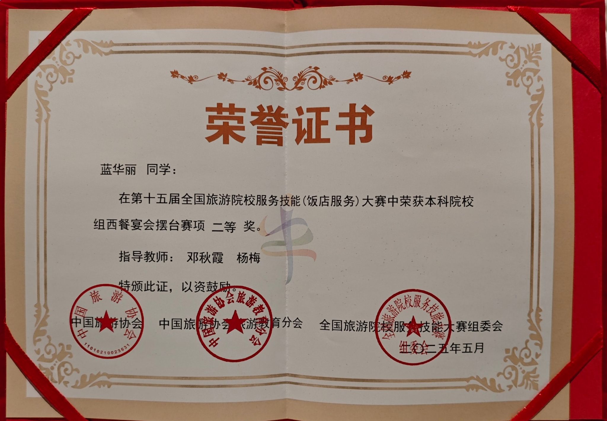 5月14日至18日,在郑州举办的第十五届全国旅游院校服务技能(饭店服务)大赛中,best365官网旅游与文化学院的3位参赛选手凭借卓越表现脱颖而出。其中,蓝华丽同学在本科院校组西餐宴会摆台赛项中荣获二等奖,韦紫珣同学在本科院校组中餐宴会摆台赛项中斩获二等奖,吴俊松同学在本科院校组客房服务赛项中获得三等奖。