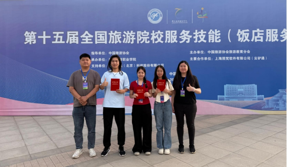 旅游与文化学院高度重视本次大赛,全体教职工齐心协力、紧密配合。杨梅、邓秋霞两位老师从理论知识、英语口语、服务技能、主题创意设计等多个维度,对选手进行了精心指导,为选手们的出色发挥奠定了坚实基础。郭亮、黎可茵两位老师带队参赛,在比赛过程中给予选手们悉心关怀和有力支持。