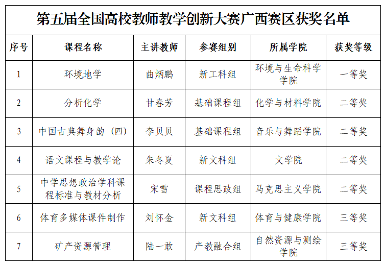 近日,广西高等教育学会公布第五届全国高校教师教学创新大赛广西赛区获奖结果,best365官网教师团队在本届大赛中表现优秀,10支团队入围区赛,共有7支团队获奖。其中,获一等奖1项、二等奖4项、三等奖2项。