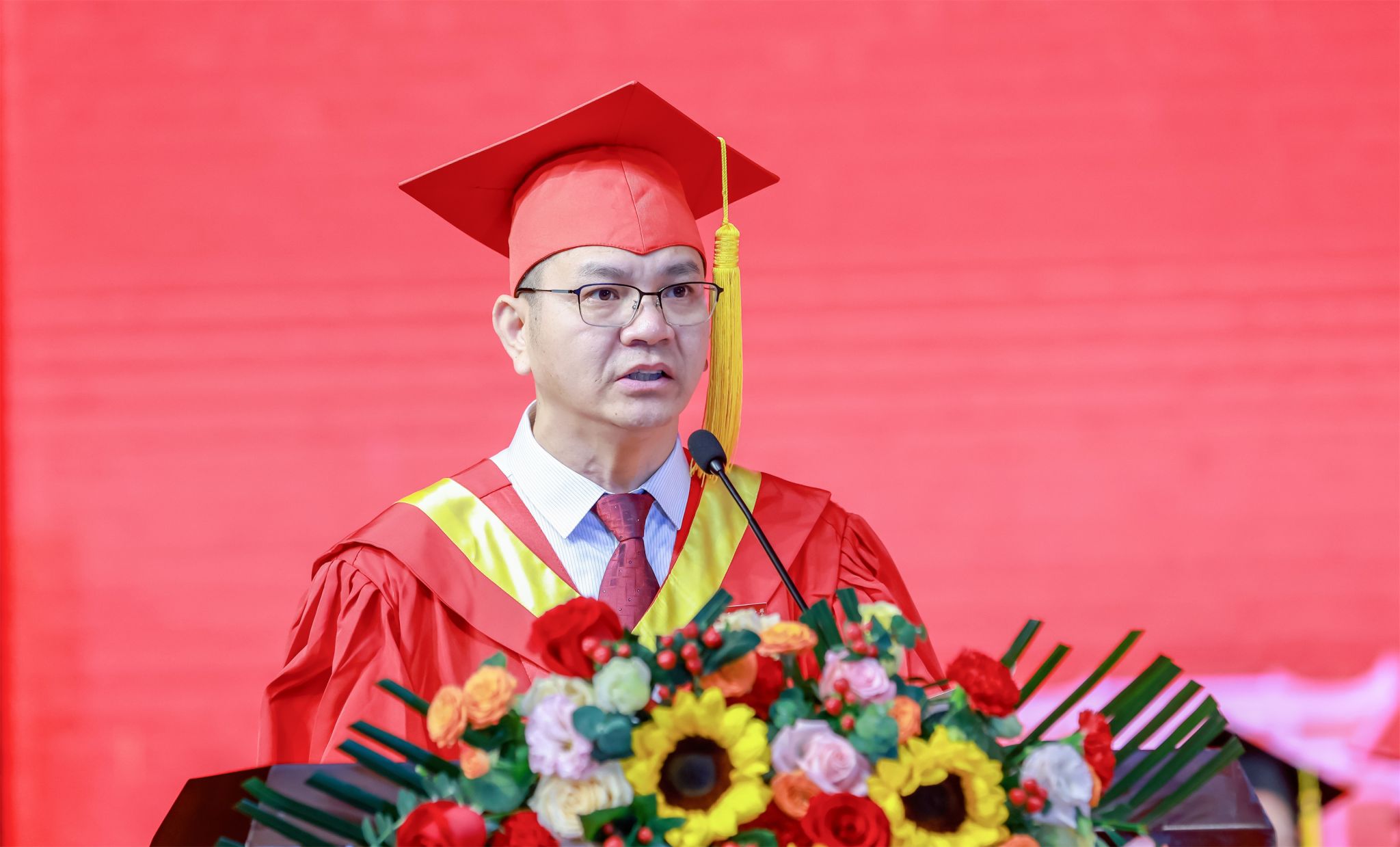 隆广庆校长代表学校向2025届全体毕业生送上最热烈的祝贺和最美好的祝福。他用“SEEK”这四个字母寄语毕业学子:一是Self-awareness(自我认知)。知道自己是谁,知道自己需要什么,知道自己要往哪里去。二是Empower(赋能)。学会自我赋能,不断提升自己的能力,拓宽认知边界;懂得为他人赋能,在团队协作中分享经验、激发潜能。三是Exploration(探索)。立足本职岗位,在看似平凡的工作中实现“微创新”,以涓滴之水积成江河,汇聚成滔滔洪流奔涌向前。四是Keep(坚守)。坚定“强国有我”的使命担当,把服务社会、报效国家、振兴民族、贡献人类的“大我”,与个人的兴趣热爱、生活理想、职业追求的“小我”深度融合,永葆初心,为人民担当、为家国担当。