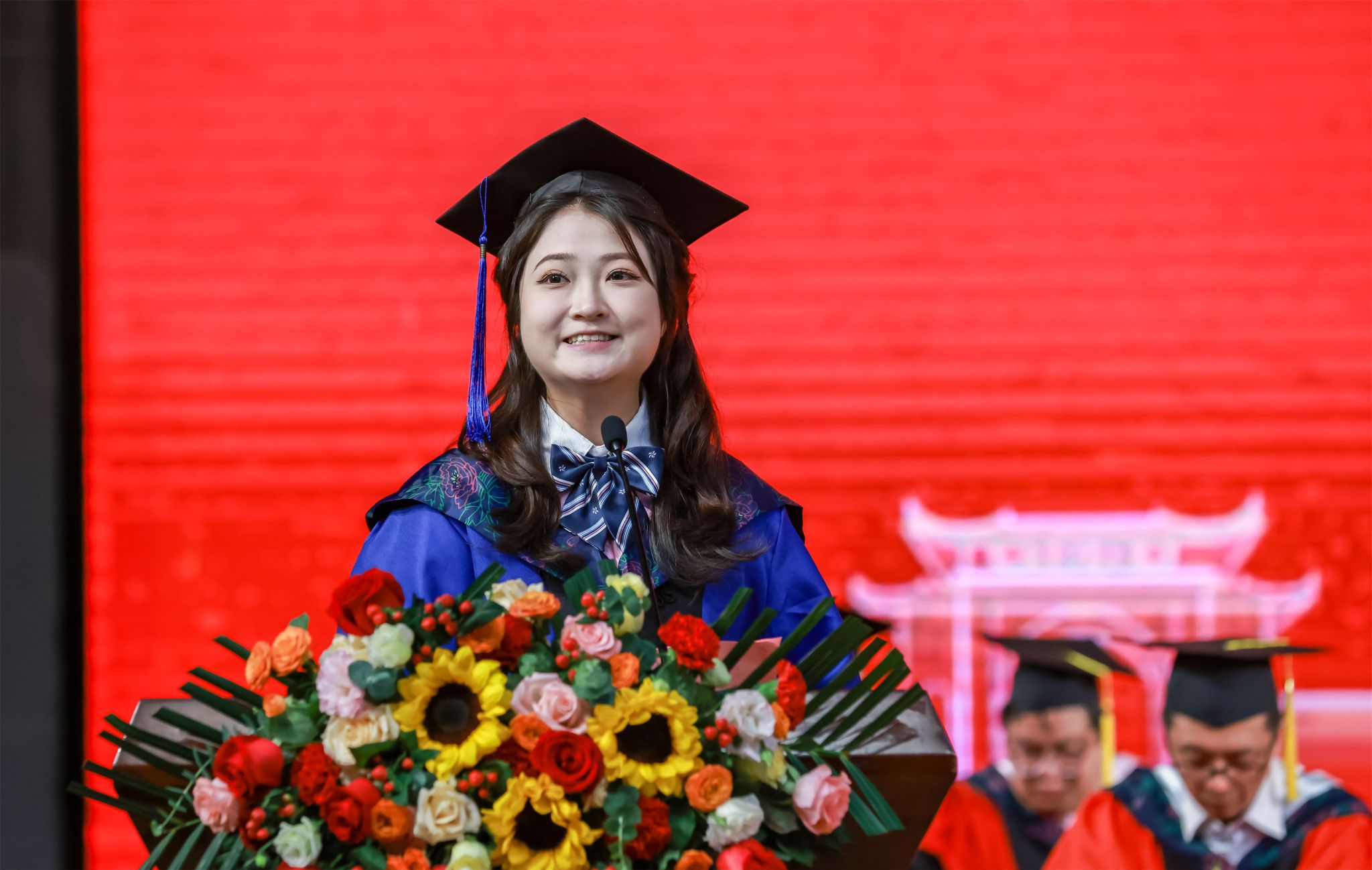 随后,七位校领导为毕业生一一正冠拨穗。毕业生们身着学位服、头顶学位帽,端举毕业证书,意气风发、笑容灿烂,享受毕业礼成的庄严神圣时刻。