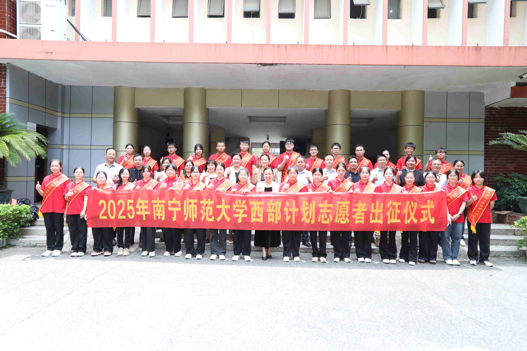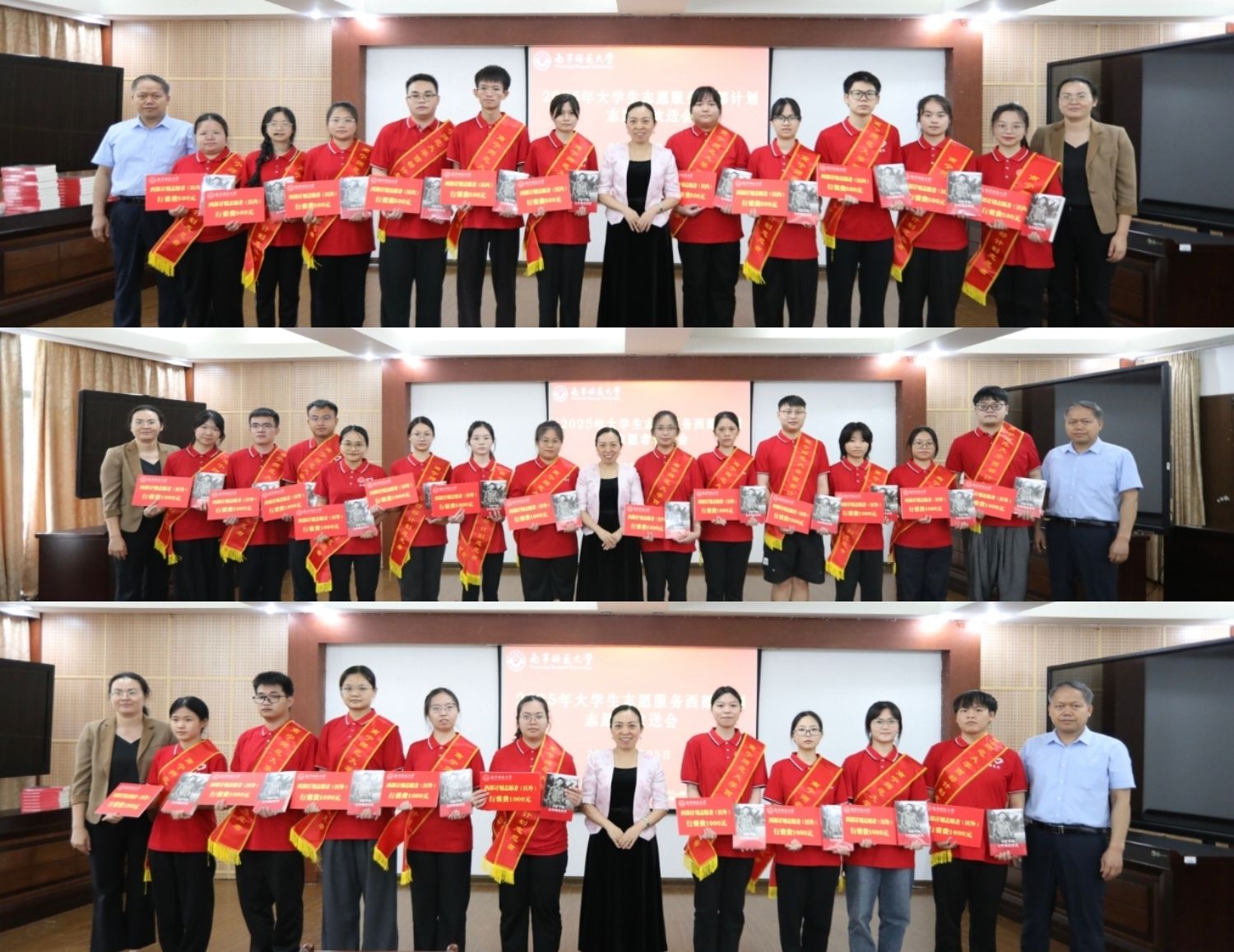 校领导为志愿者们颁发行囊物资,背包装满勇气,T恤印刻青春,伞能遮风挡雨,这份“逐浪启程礼包”承载着母校对远行学子的贴心关怀。此次欢送会不仅是对志愿者的温情送别,更是一堂生动的思政育人课。未来,学校将持续关注志愿者们的成长发展,激励更多南师学子以他们为榜样,让“奉献、友爱、互助、进步”的志愿精神在西部大地生根发芽,以青春之我、奋斗之我为中国式现代化建设贡献南师力量。
