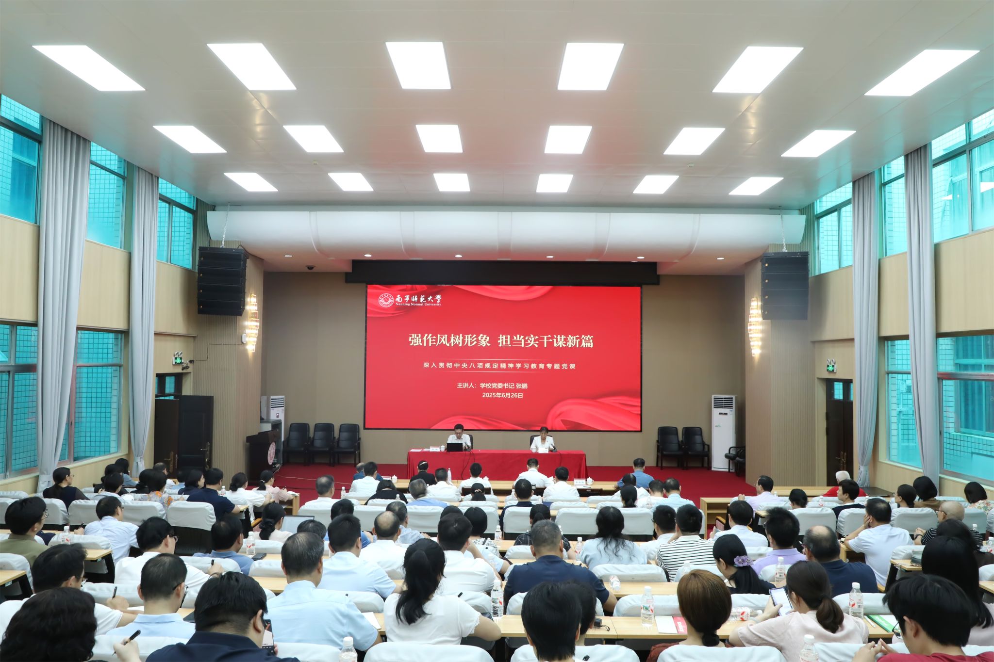 6月26日下午,学校党委书记张鹏以《强作风树形象 担当实干谋新篇》为题讲授深入贯彻中央八项规定精神学习教育专题党课。全体校领导、全体中层干部及附属实验学校、附属幼儿园主要负责人参加。党课由学校纪委书记李美清主持。