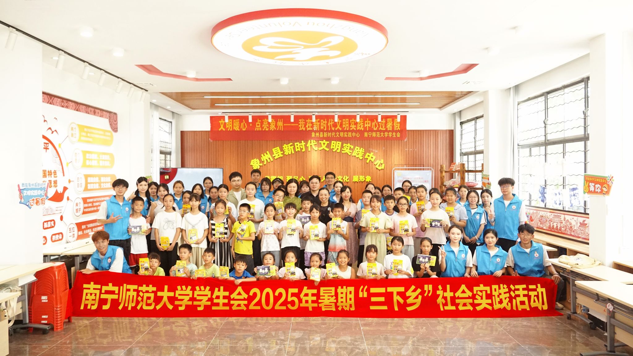 在象州镇新时代文明实践中心,龙妮娜一行观摩了实践团队为当地孩子们开设的理论宣讲课堂,并与孩子们亲切交流。孩子们表演了舞蹈《听我说》,展示了扎染、硬笔书法及绘画作品。龙妮娜一行为孩子们送上了学习用品,鼓励他们努力学习、健康成长。随后,龙妮娜一行来到象州县博物馆,亲切慰问实践团队成员。她勉励队员们珍惜实践机会,发扬吃苦耐劳精神,在实践中磨练意志、增长才干;同时希望同学们深入了解象州历史文化,用心传承地方文脉,并通过扎实的服务工作,展现新时代南师青年的责任与担当。