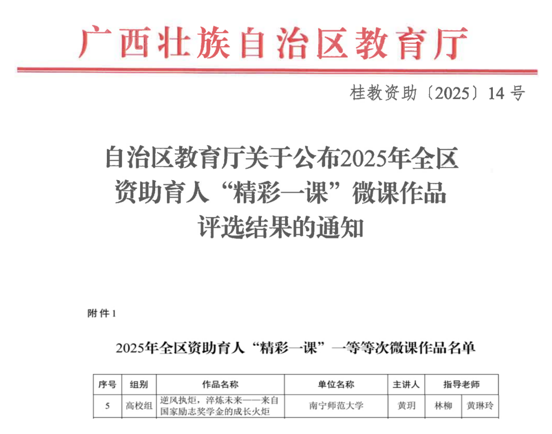 近日,自治区教育厅公布了2025年全区资助育人“精彩一课”微课作品评选结果,best365官网黄玥老师的微课作品《逆风执炬,淬炼未来——来自国家励志奖学金的成长火炬》荣获一等等次。本次活动由自治区教育厅主办,旨在深入落实立德树人根本任务,持续深化发展型资助育人体系建设,集中展现新时代资助工作者的综合素质、专业水平和育人素养,为受奖助学生的成长成才提供科学指引与精神滋养。