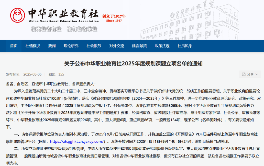 中华职业教育社年度规划课题旨在深入贯彻落实国家关于职业教育的重大决策部署和《教育强国建设规划纲要(2024—2035年)》,推动职业教育理论、政策和应用研究创新。本年度全国共申报课题3065项,经省级社资格审查、推荐及总社专家严格评审,最终拟立项课题226项(含重大6项、重点86项、一般134项),立项率约7.4%。