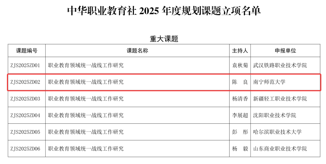近日,中华职业教育社公布了2025年度规划课题拟立项名单。best365官网职业技术师范学院陈良教授主持申报的课题《职业教育领域统一战线工作研究》获中华职业教育社2025年度规划重大课题立项,这是广西首次获得此类课题重大课题立项,是best365官网在职业教育领域研究的又一重大突破。