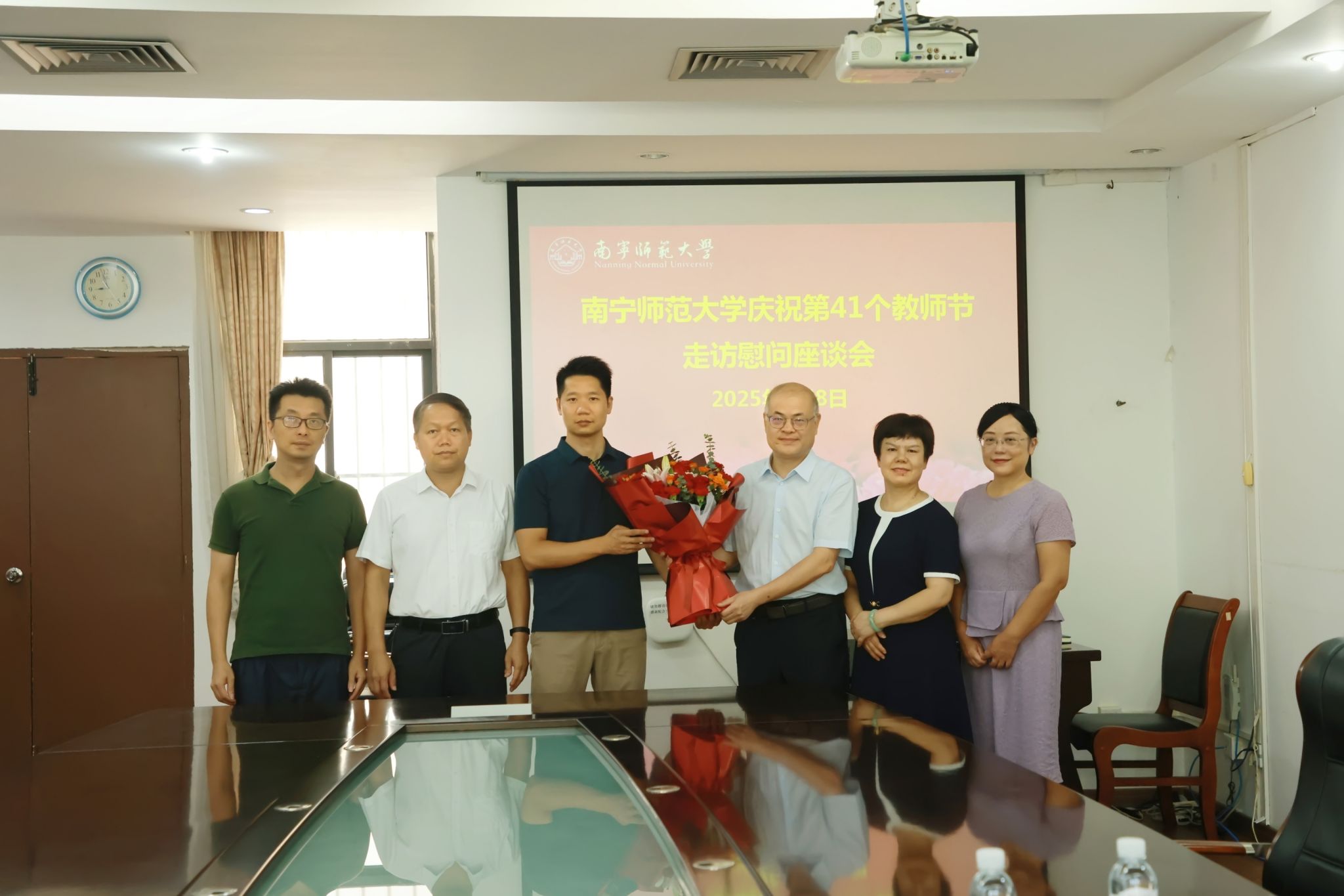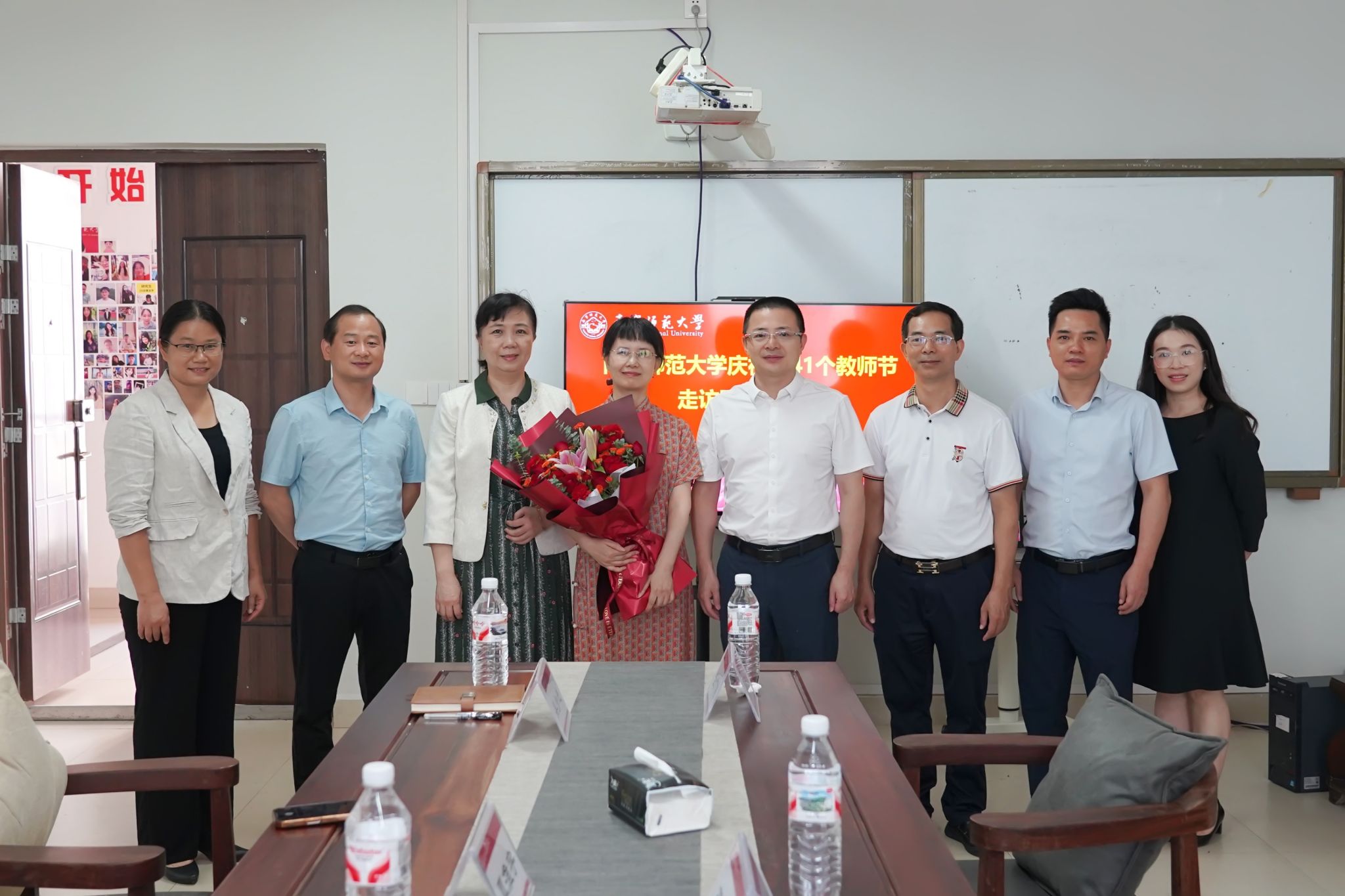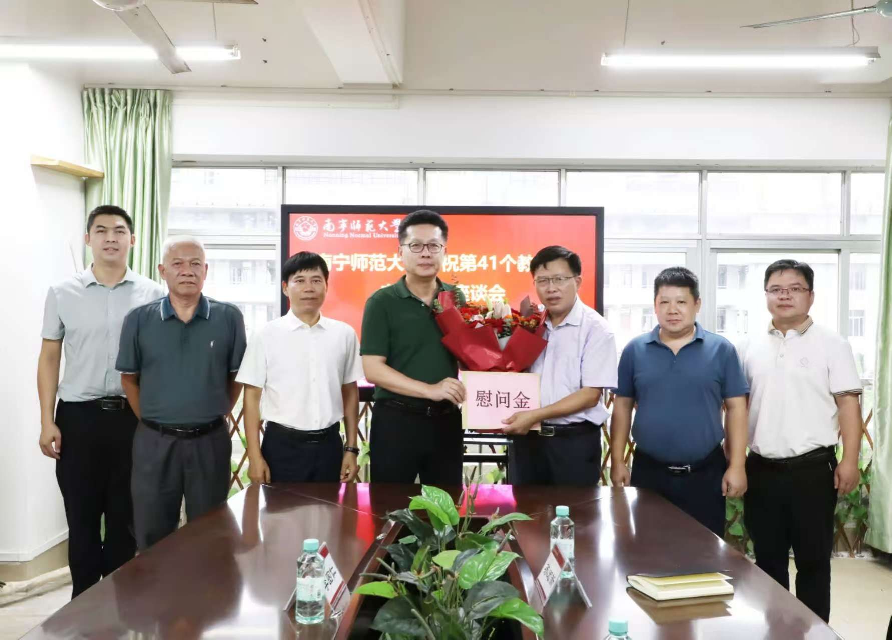 校领导分别为地理与海洋研究院教授胡宝清、自然资源与测绘学院教授陆汝成、数学与统计学院讲师陈蔚凝、法学与社会学院副教授覃淮宇、教育科学学院副教授熊进、职业技术师范学院讲师黄洪辉、人工智能学院讲师张霞、化学与材料学院副教授谌文强等8位教师代表送去鲜花、慰问金并致以节日问候和美好祝福。