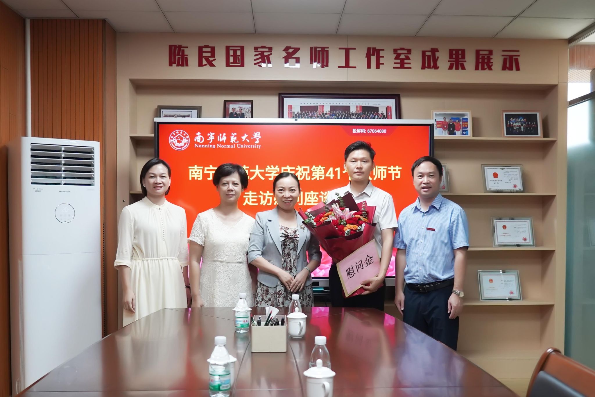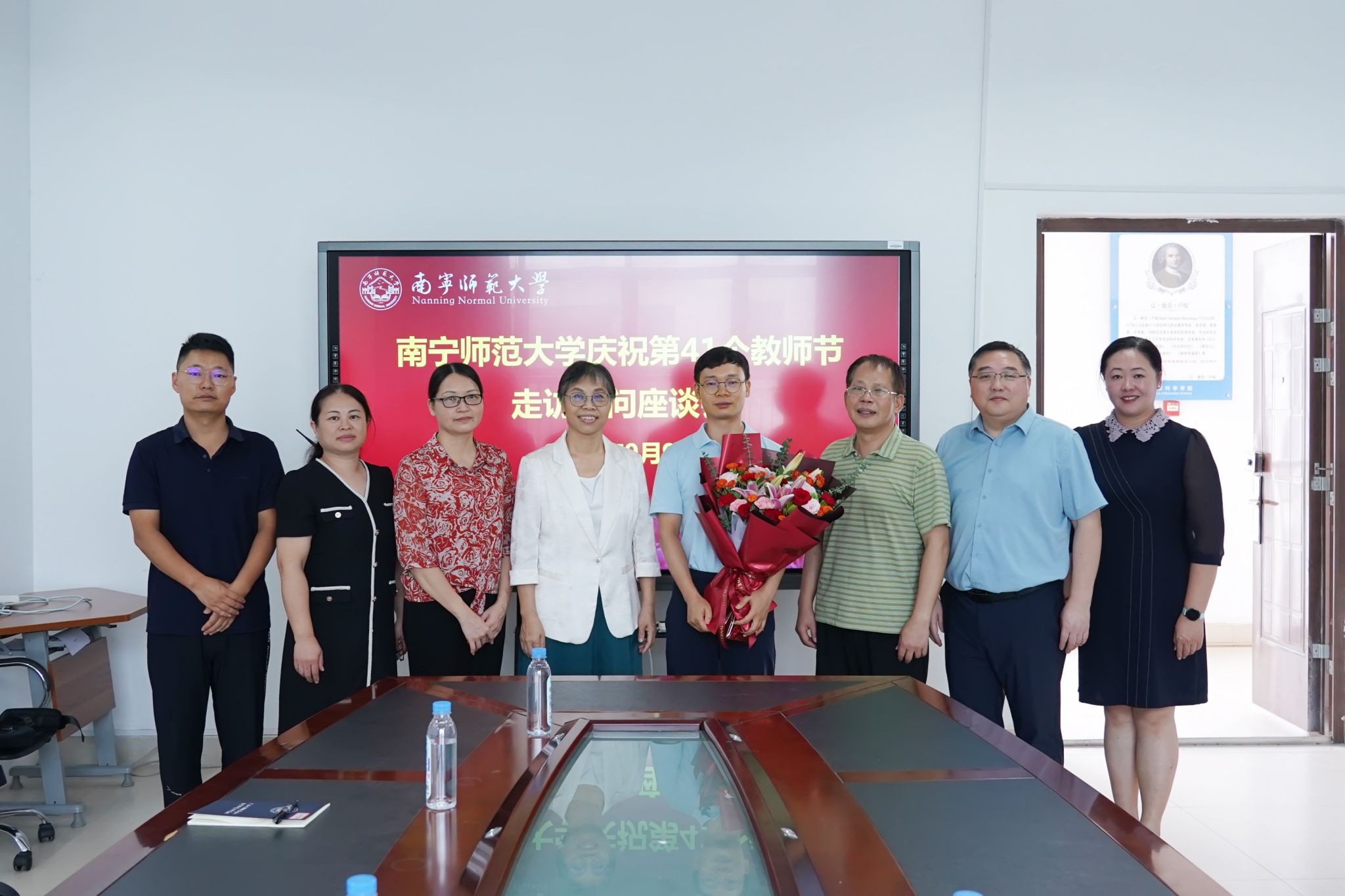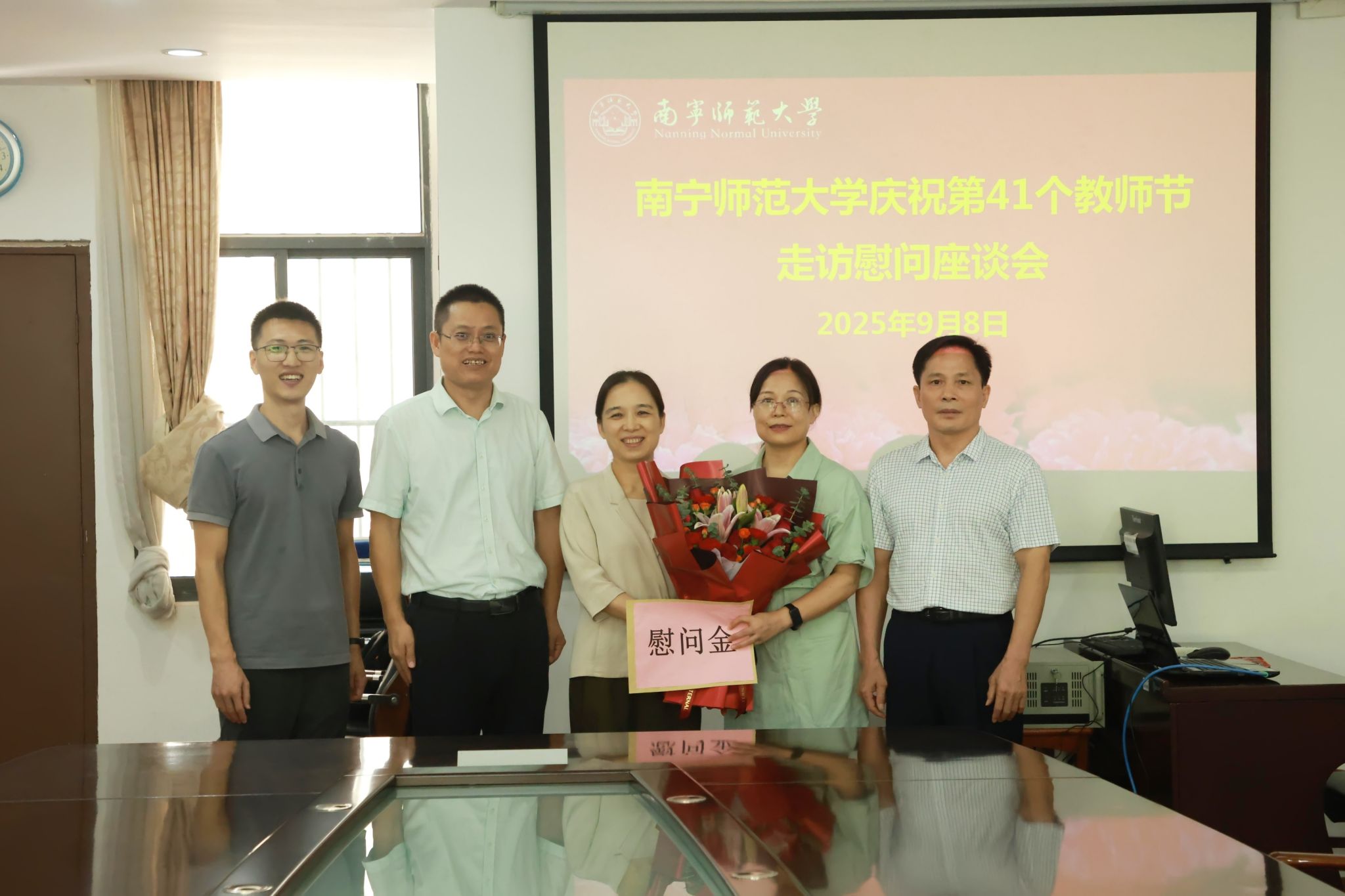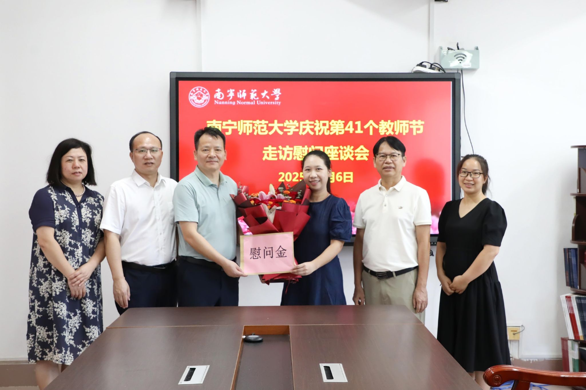 校领导分别为地理与海洋研究院教授胡宝清、自然资源与测绘学院教授陆汝成、数学与统计学院讲师陈蔚凝、法学与社会学院副教授覃淮宇、教育科学学院副教授熊进、职业技术师范学院讲师黄洪辉、人工智能学院讲师张霞、化学与材料学院副教授谌文强等8位教师代表送去鲜花、慰问金并致以节日问候和美好祝福。