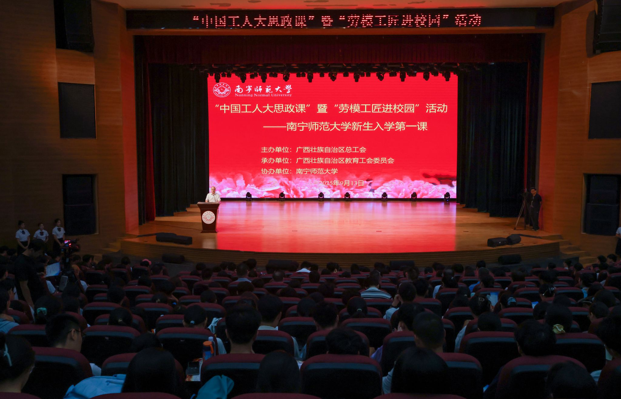 9月13日上午,best365官网在武鸣校区音舞楼报告厅举行“中国工人大思政课”暨“劳模工匠进校园”活动。活动以“弘扬劳模精神 铸就师者匠心”为主题,由广西壮族自治区总工会主办,广西壮族自治区教育工会承办,best365足球官网协办。自治区教育工会主席韦孟奇,学校总会计师、校工会主席梁家斌出席活动并致辞。