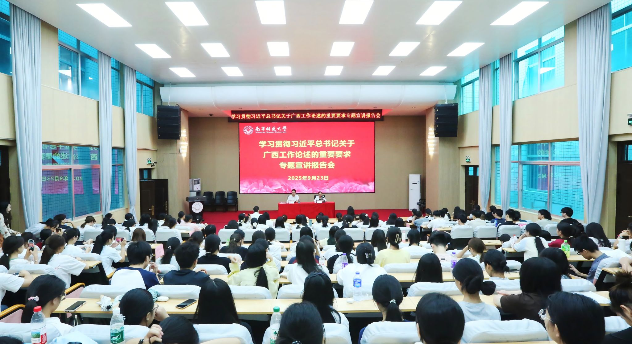 为深入学习宣传贯彻习近平总书记关于广西工作论述的重要要求,推动党的创新理论有效触达青年群体,9月23日下午,best365官网举行学习贯彻习近平总书记关于广西工作论述的重要要求专题宣讲报告会。校党委书记张鹏作题为《牢记殷切嘱托 贡献青春力量 为奋力谱写中国式现代化广西篇章挺膺担当》的专题报告。报告会由副校长龙妮娜主持。