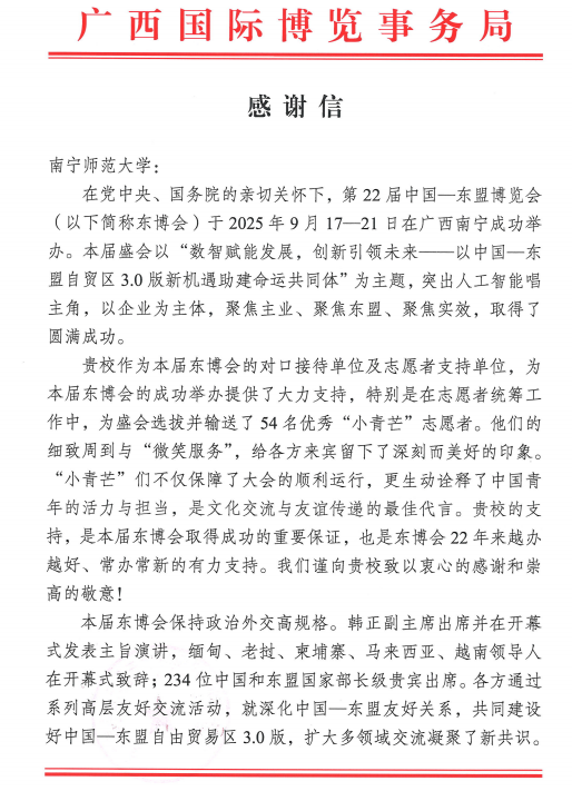 近日,best365官网收到广西国际博览事务局发来的感谢信,对best365官网作为第22届中国—东盟博览会(以下简称东博会)的对口接待单位和志愿者支持单位,为其成功举办提供了大力支持表示衷心的感谢,特别是为盛会选拔并输送了54名优秀“小青芒”志愿者。