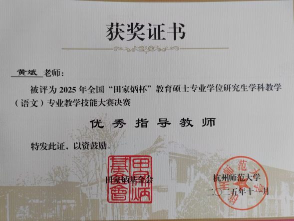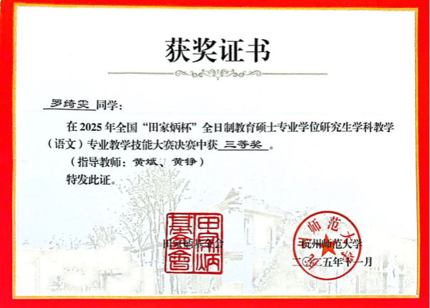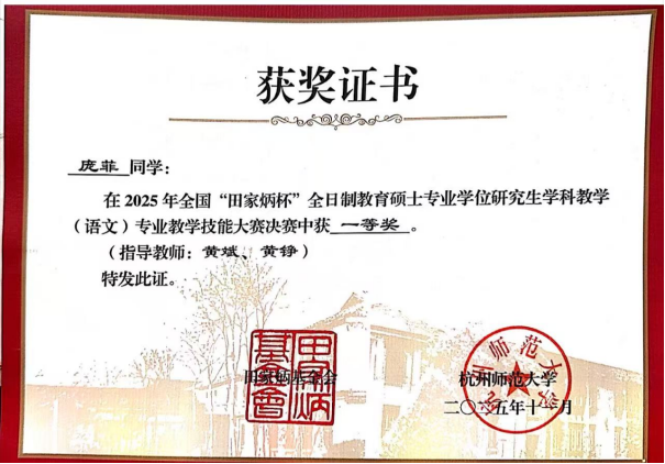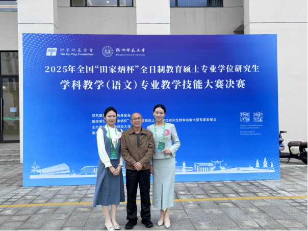 11月7日至9日,2025年全国“田家炳杯”全日制教育硕士专业学位研究生学科教学(语文)专业教学技能大赛决赛在杭州师范大学举行。best365官网2024级学科教学(语文)专业研究生庞菲、罗绮雯凭借扎实的专业功底和出色的赛场表现脱颖而出,分别荣获国家级一等奖、三等奖,黄斌老师获评“优秀指导教师”称号。