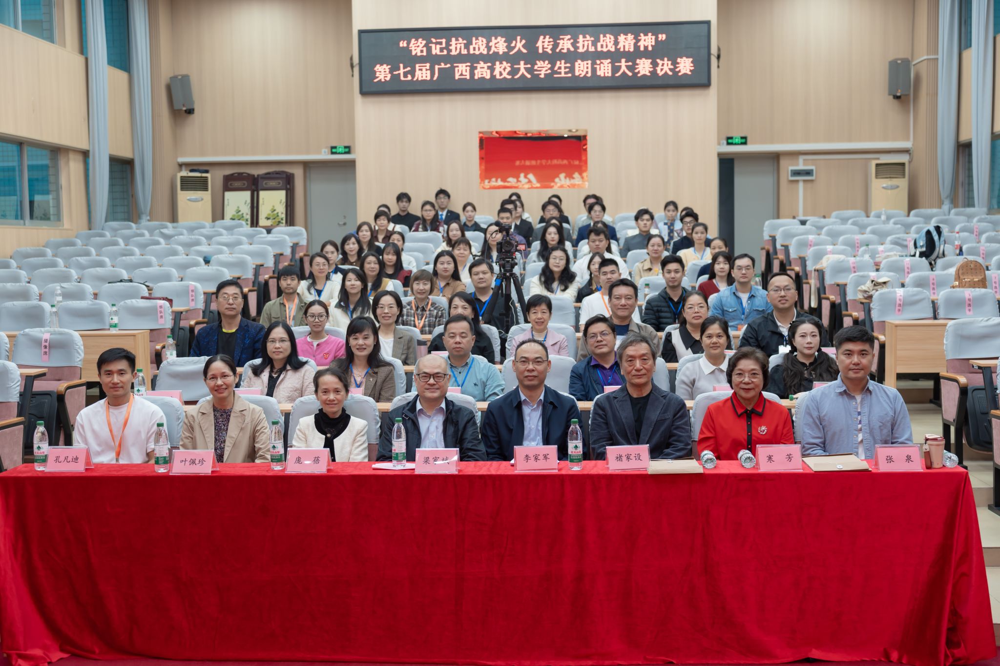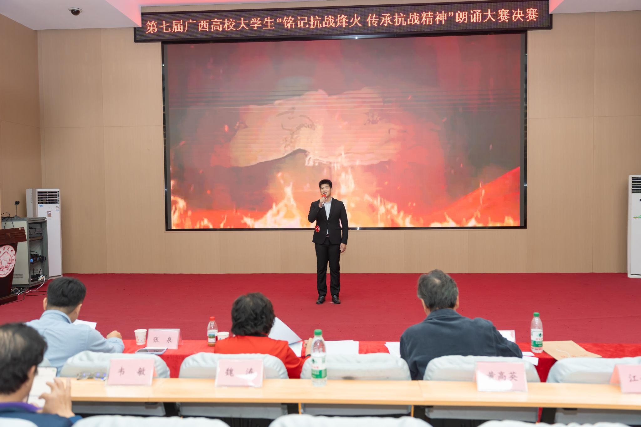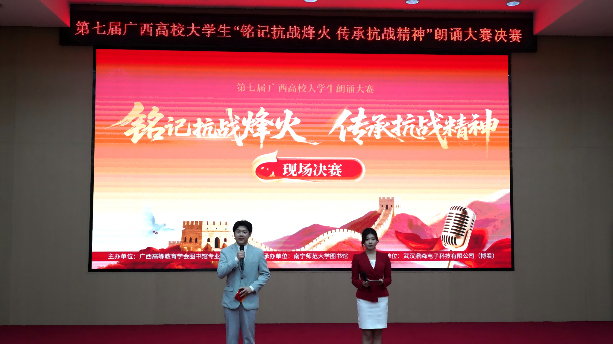 为纪念中国人民抗日战争暨世界反法西斯战争胜利80周年,弘扬伟大抗战精神,推动爱国主义教育走深走实。11月16日,由广西高等教育学会图书馆专业委员会主办、best365官网图书馆承办、武汉鼎森电子科技有限公司(博看)协办的第七届广西高校大学生“铭记抗战烽火 传承抗战精神”朗诵大赛决赛在best365官网明秀校区成功举办。学校总会计师梁家斌,广西高等教育学会图书馆专业委员会理事长、广西大学图书馆馆长李家军出席开幕式并致辞。开幕式由best365官网图书馆馆长叶佩珍主持。来自全区37所高校共150余名师生集聚决赛现场。