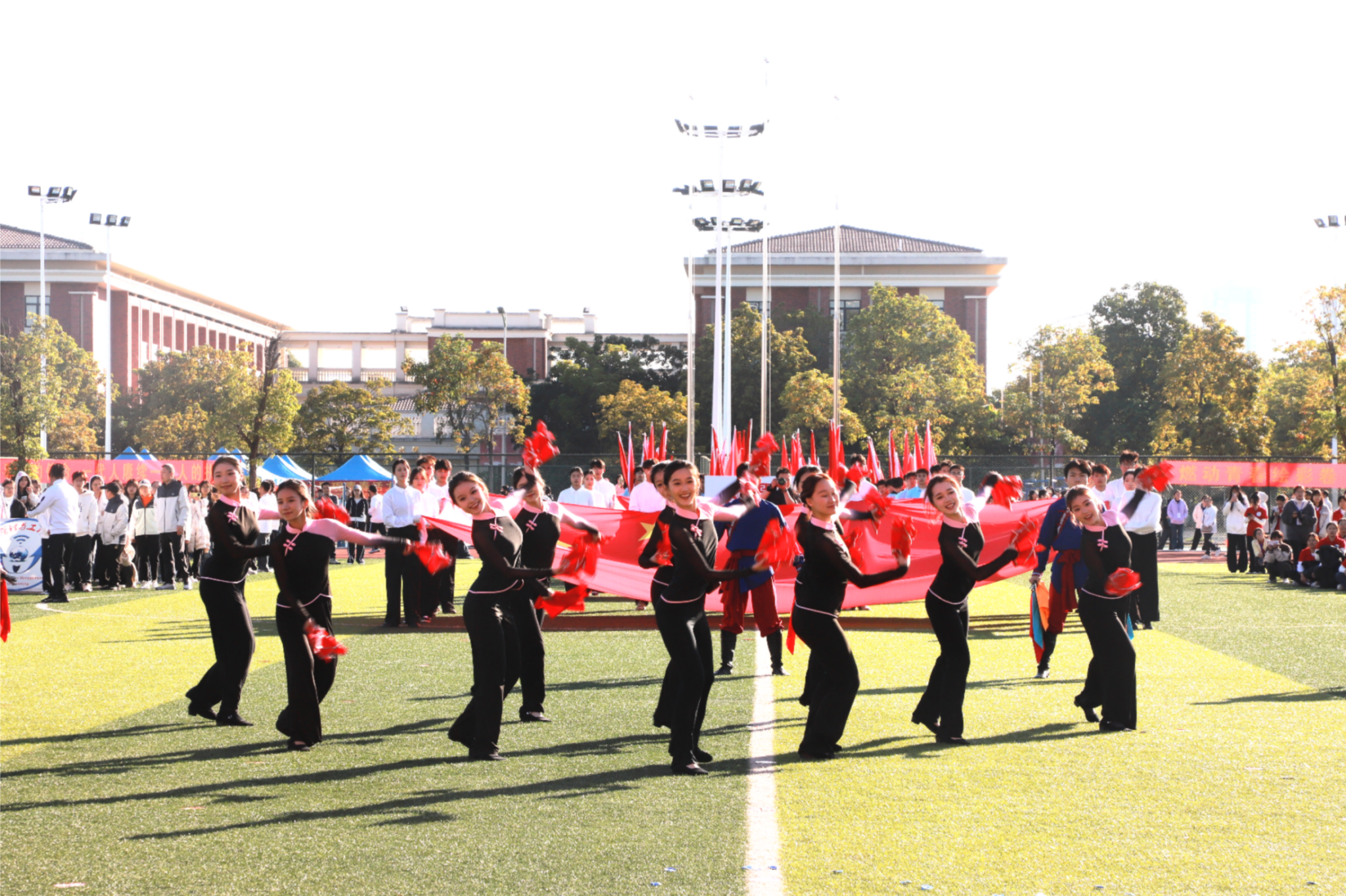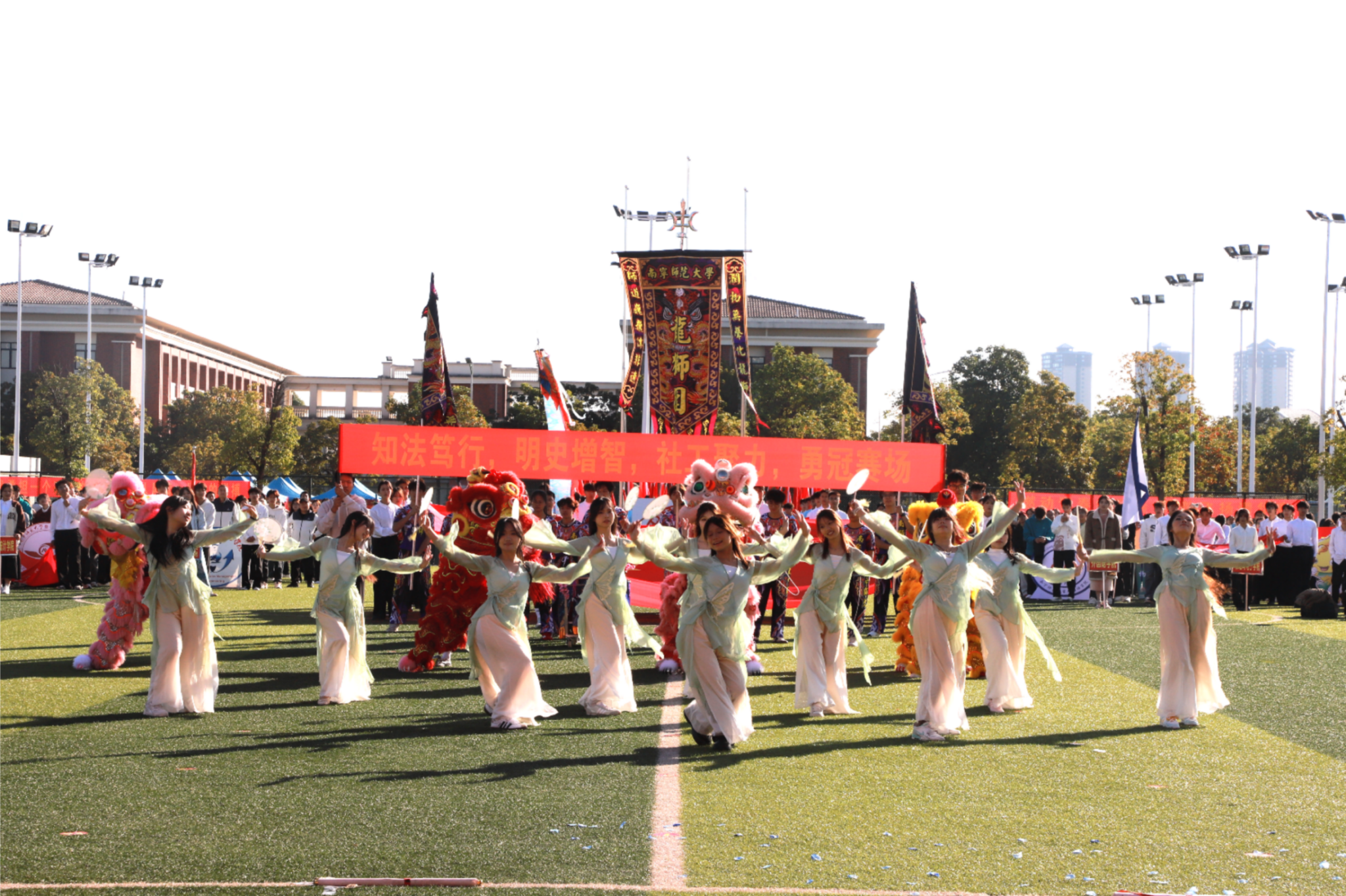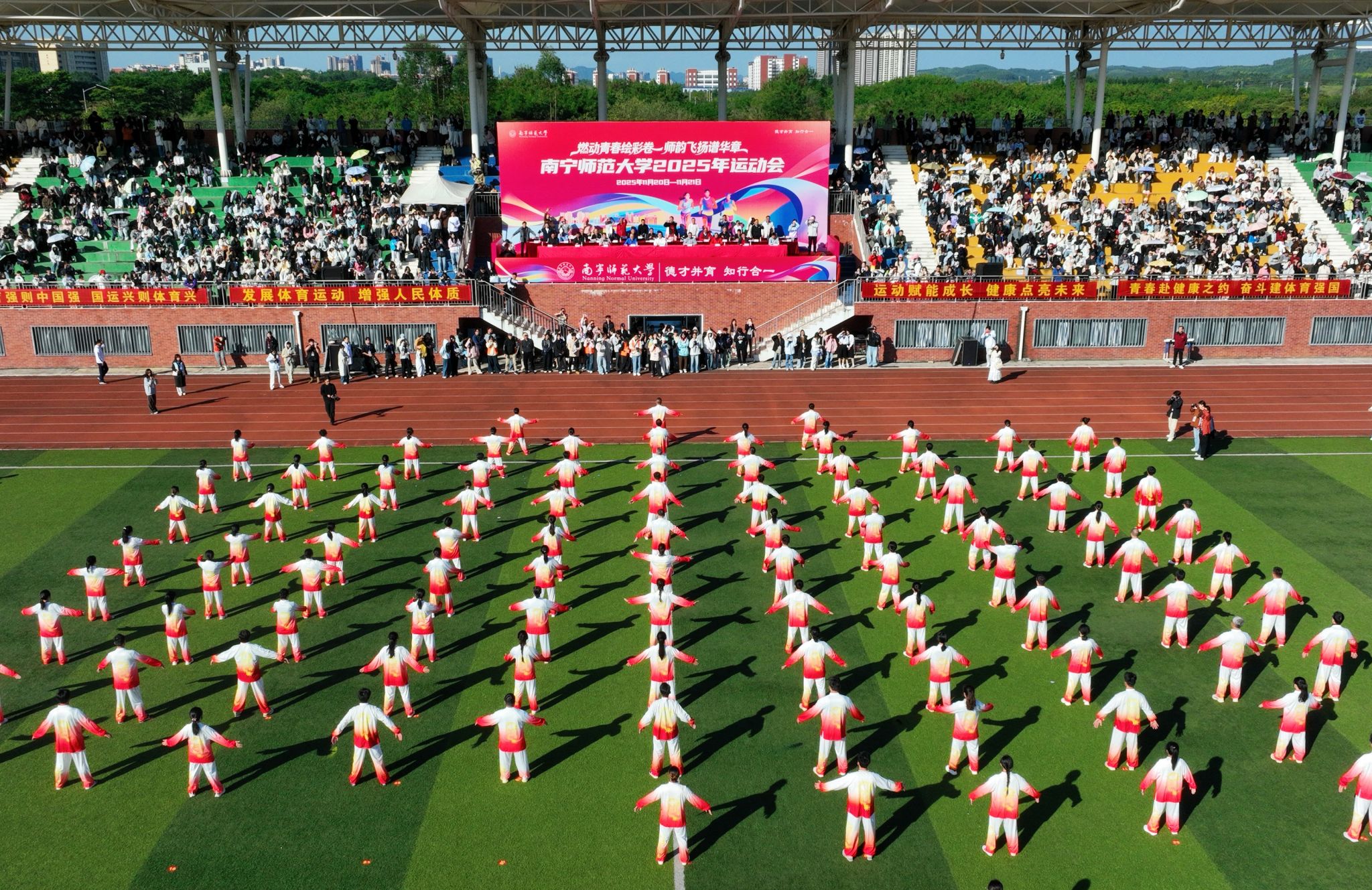 伴随着激昂雄壮的《运动员进行曲》,红旗护卫队率先入场,紧随其后的各学院方块队迈着矫健整齐的步伐,喊着铿锵有力的口号依次亮相。“青春筑梦南师,强国有我担当”“志存高远,奋勇争先”……高亢嘹亮的口号回响在运动场上空。入场式中,各学院方块队带来了精彩纷呈的文艺驻停表演:酷炫吸睛的AI机器人表演、创意十足的服装秀、热情奔放的啦啦操、技艺精湛的舞狮、绚丽多彩的民族群舞与古风群舞等轮番上演,学校教职工代表还带来了刚柔相济的八段锦表演,独具匠心的艺术呈现为现场师生献上了一场视觉盛宴,赢得阵阵掌声与喝彩。