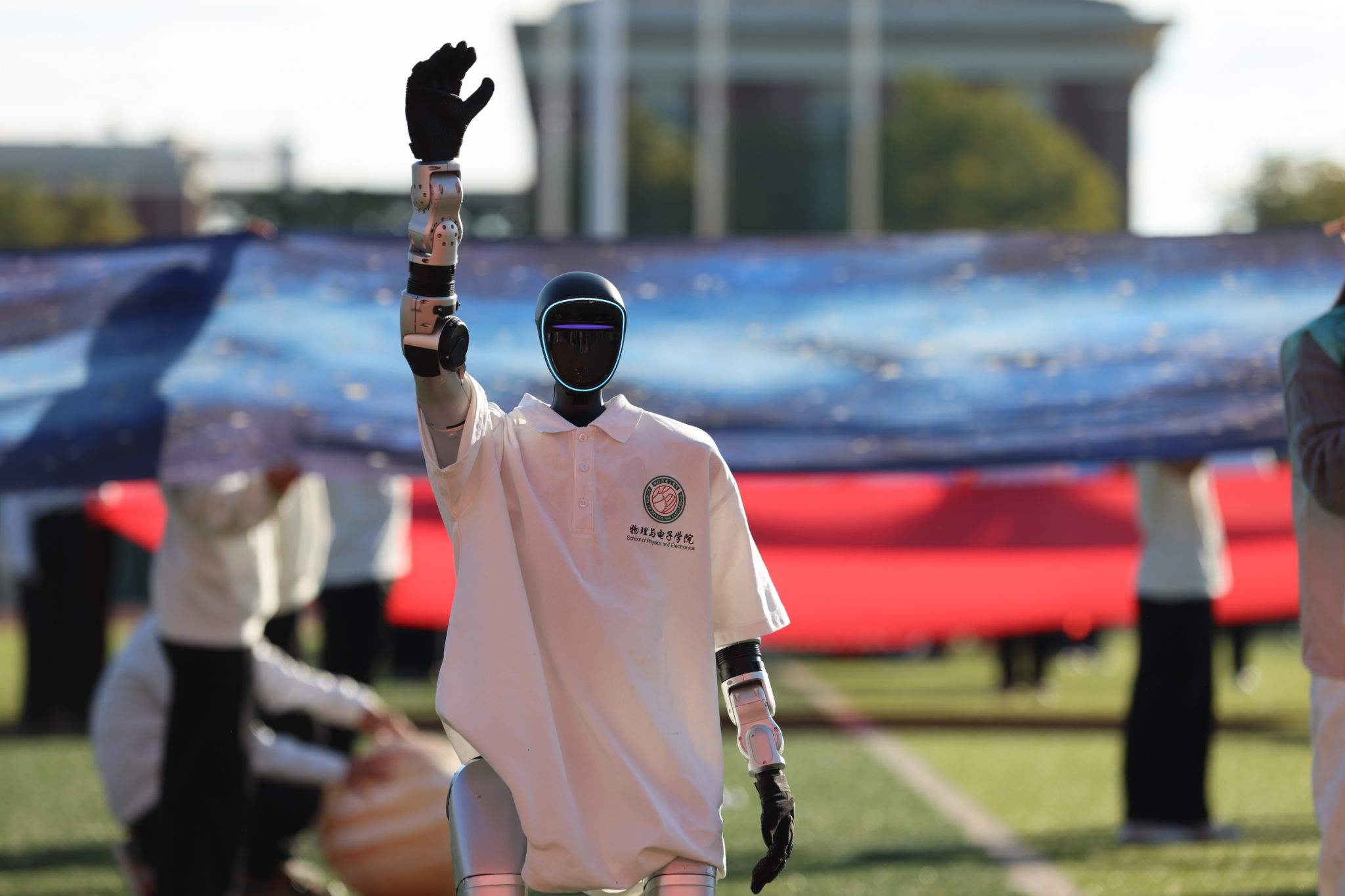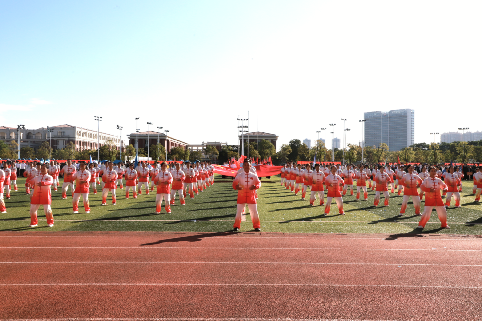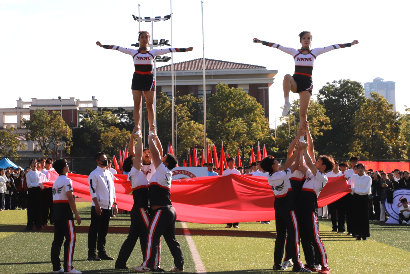 伴随着激昂雄壮的《运动员进行曲》,红旗护卫队率先入场,紧随其后的各学院方块队迈着矫健整齐的步伐,喊着铿锵有力的口号依次亮相。“青春筑梦南师,强国有我担当”“志存高远,奋勇争先”……高亢嘹亮的口号回响在运动场上空。入场式中,各学院方块队带来了精彩纷呈的文艺驻停表演:酷炫吸睛的AI机器人表演、创意十足的服装秀、热情奔放的啦啦操、技艺精湛的舞狮、绚丽多彩的民族群舞与古风群舞等轮番上演,学校教职工代表还带来了刚柔相济的八段锦表演,独具匠心的艺术呈现为现场师生献上了一场视觉盛宴,赢得阵阵掌声与喝彩。