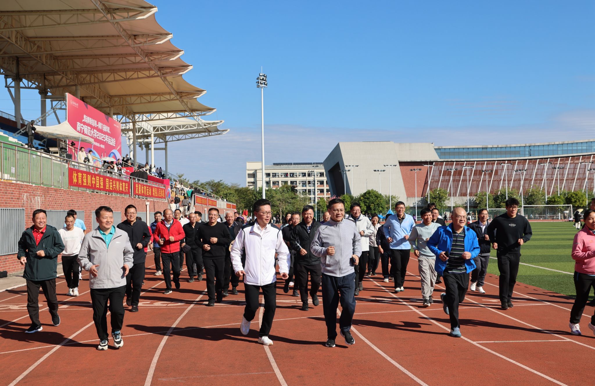 开幕式结束后,校领导带领处级干部在田径场上开展best365足球官网2025年校园健身跑启动仪式,并绕田径场进行400米健身跑。