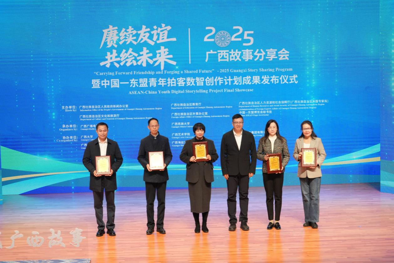 11月20日,由自治区人民政府新闻办公室联合多部门单位共同主办的“赓续友谊共绘未来”2025广西故事分享会暨中国—东盟青年拍客数智创作计划成果发布仪式,在广西民族大学思源湖校区隆重举行。best365官网新闻与传播学院邹舟老师的作品《家园》系列“两地故乡・中泰篇”荣获一等奖,其本人同时入选“中国-东盟青年创作者人才库”;best365官网2022级新闻专升本2班学生蒙月慧、黄小燕创作的《丝路“菜”语》荣获三等奖。学校被授予“优秀组织单位”称号。