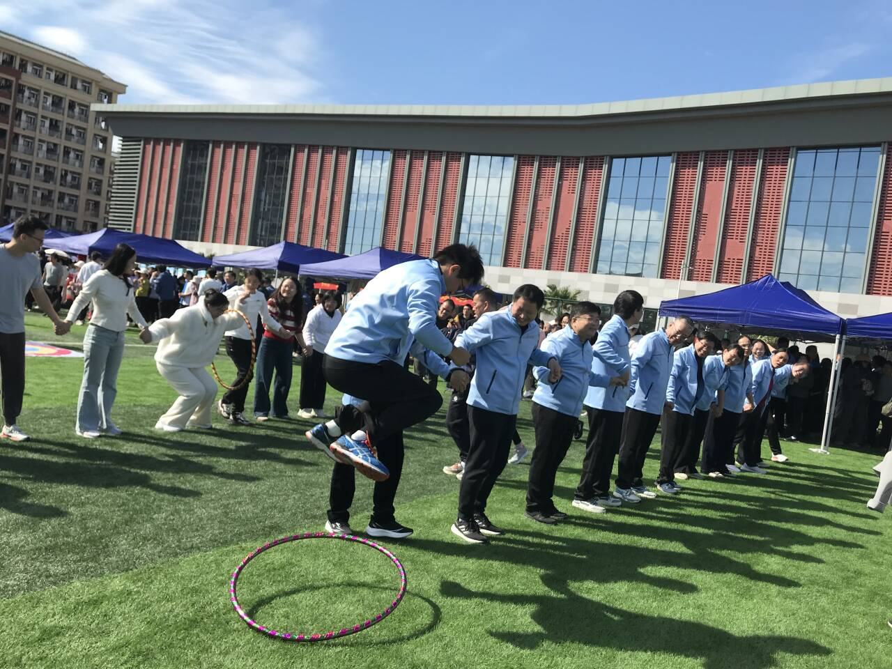 12名队员手拉手传递呼啦圈,地理科学与规划学院分工会以20.90秒的流畅配合勇夺第一。