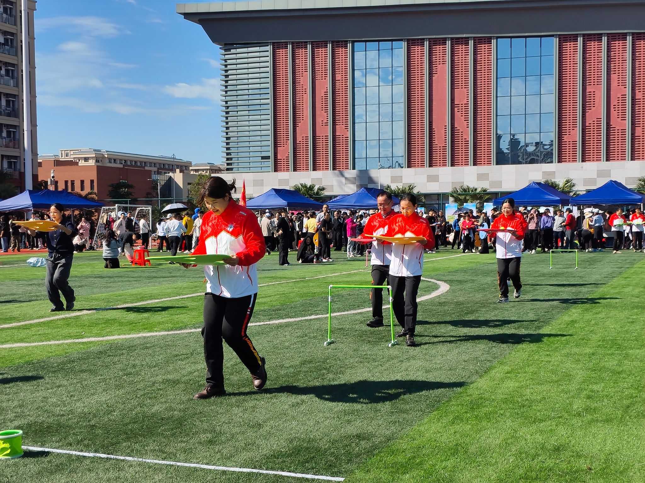 八人团队需手持纤维板跨障碍运球至终点。地理科学与规划学院分工会以1分47.57秒的成绩夺冠,展现了出色的平衡与协作能力。