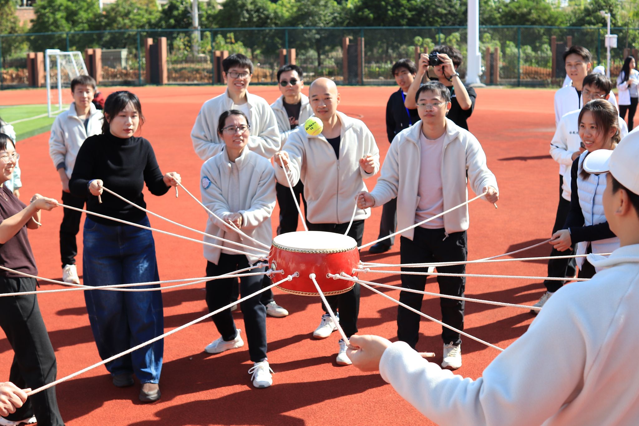 十二人团队通过控制鼓面颠球,地理与海洋研究院分工会以卓越的团队默契夺得冠军。