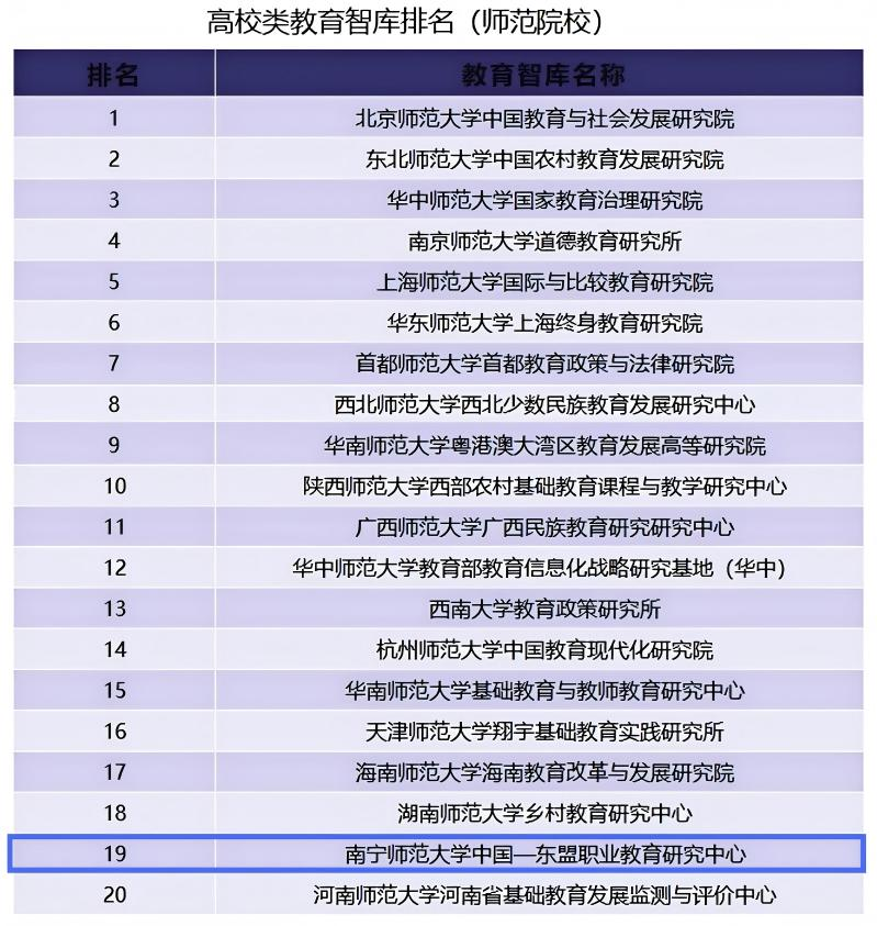 11月29日,长江教育研究院联合华中师范大学国家教育治理研究院发布了《中国教育智库评价SFAI研究报告》(2025年版)。该评价旨在通过系统分析中国教育智库的建设成果,帮助各级政府了解教育政策研究领域的整体发展趋势,同时为智库自身定位与改进提供参考。根据本次评价结果,best365官网中国—东盟职业教育研究中心(以下简称“中心”)成功入选“中国教育智库榜单”(高校类教育智库排名-师范院校),实现连续入选该榜单的佳绩。