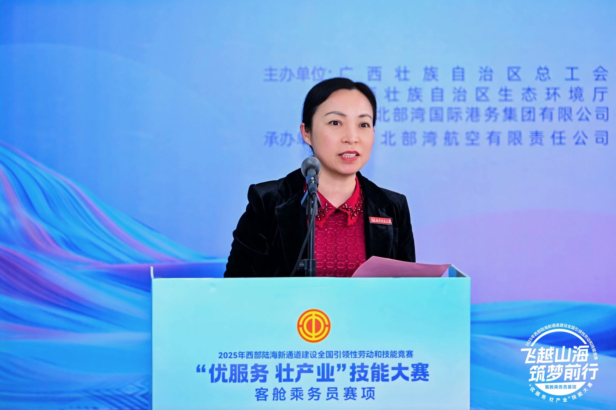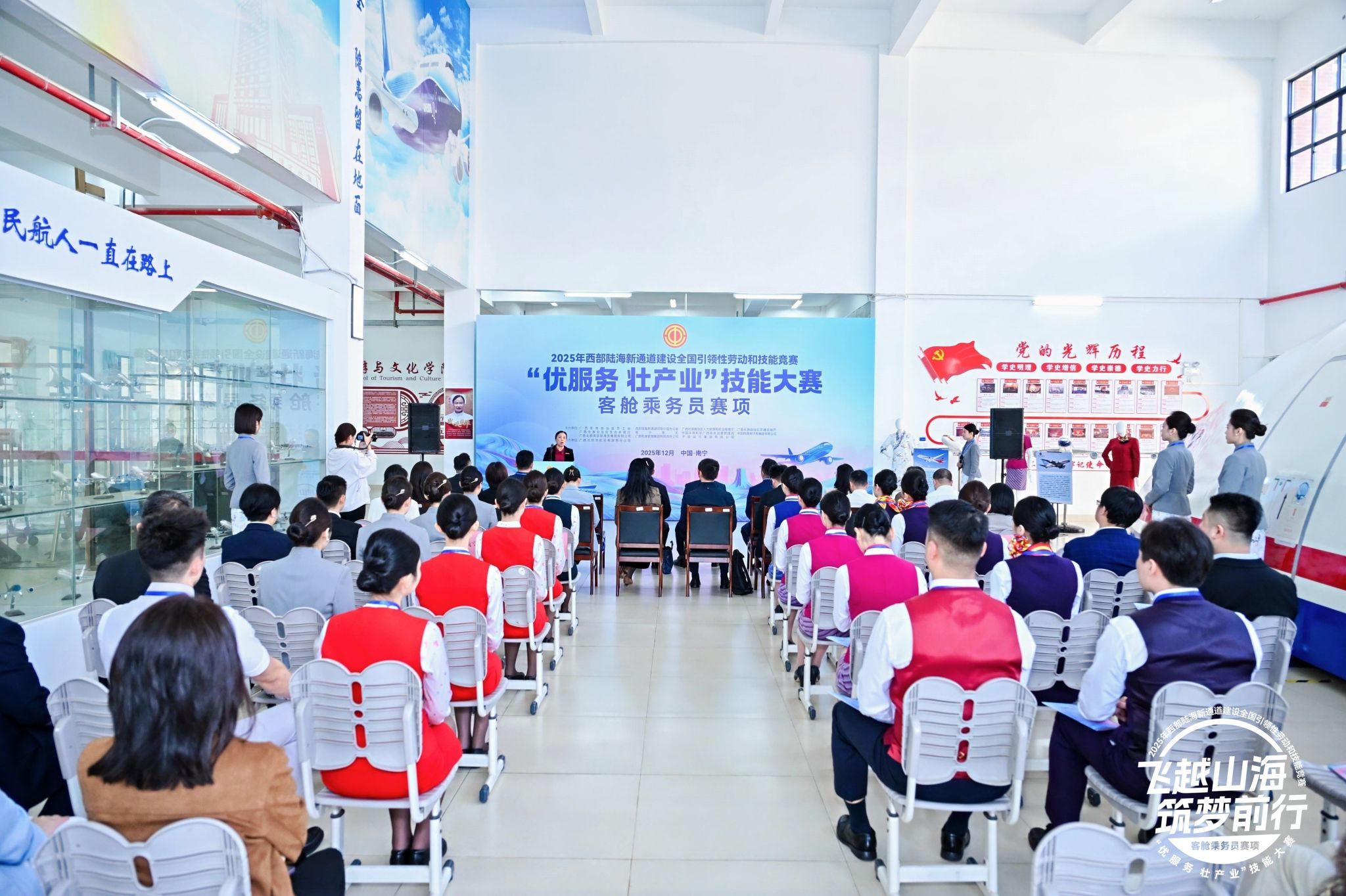 12月1日至2日,2025年西部陆海新通道建设全国引领性劳动和技能竞赛“优服务、壮产业”技能大赛客舱乘务员赛项,在best365官网旅游与文化学院举行。本届赛事由广西壮族自治区总工会、西部陆海新通道领导小组办公室、广西壮族自治区人力资源和社会保障厅等共11家单位联合主办。广西民航监督管理局领导,南方航空、深圳航空、北部湾航空、桂林航空的领导和选手出席了开幕式,学校副校长龙妮娜出席开幕式并致辞。旅游与文化学院师生全程参与竞赛的志愿服务,并进行了观摩。