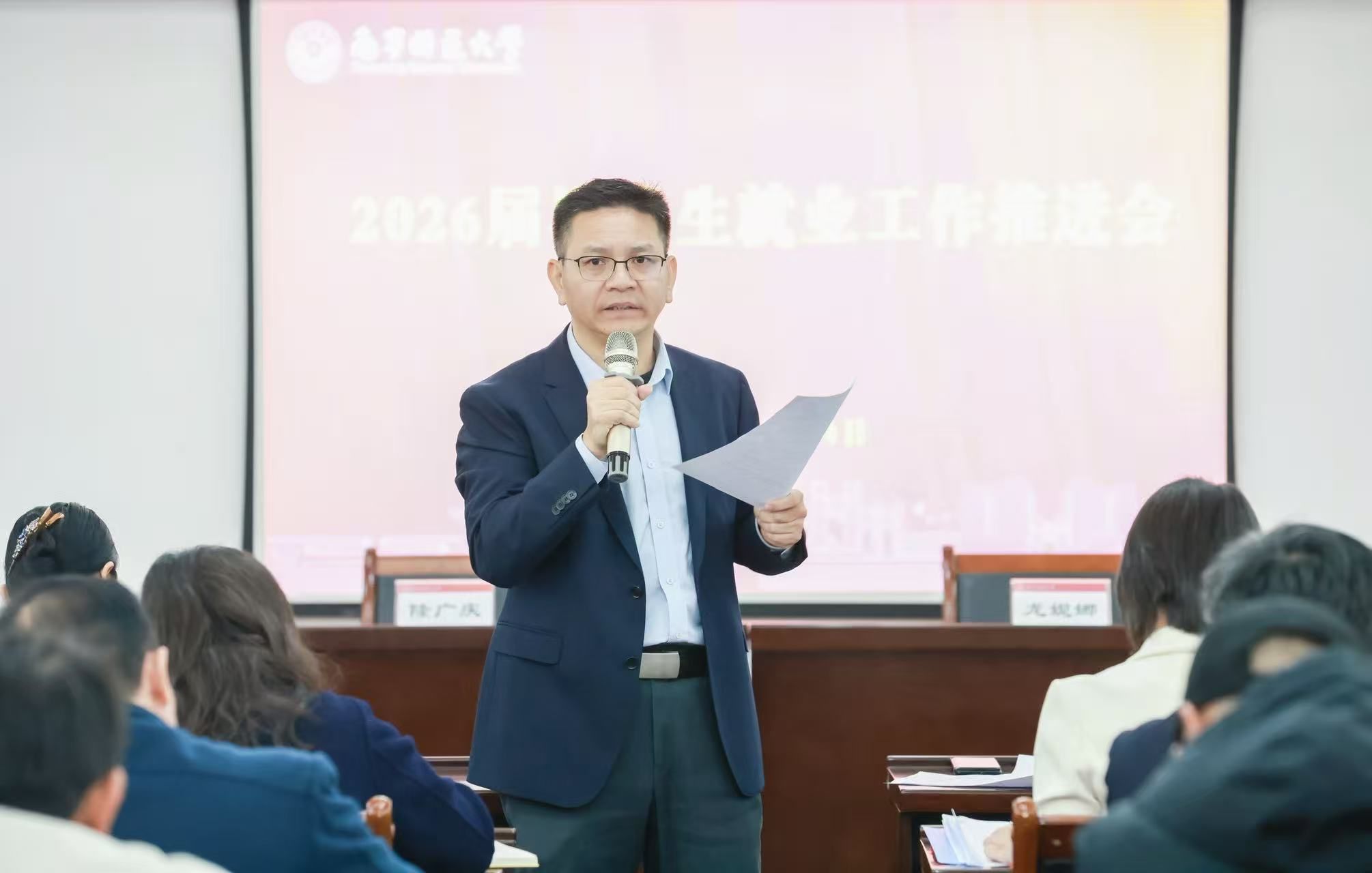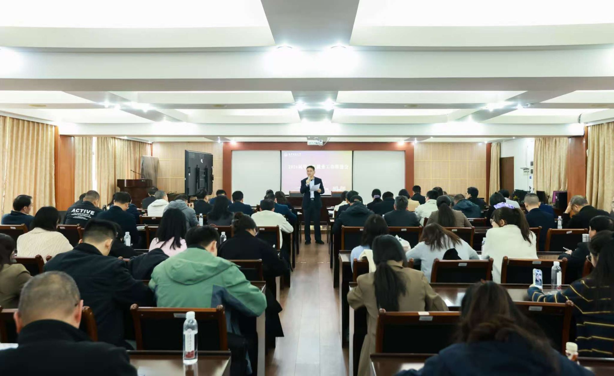 学校相关职能部门主要负责人、各学院党政负责人、分管就业工作领导、毕业班辅导员及学生就业指导中心全体人员参加会议。本次会议进一步统一了思想,明确了方向,凝聚了共识,为扎实推进2026届毕业生更高质量、更充分就业奠定了坚实基础。