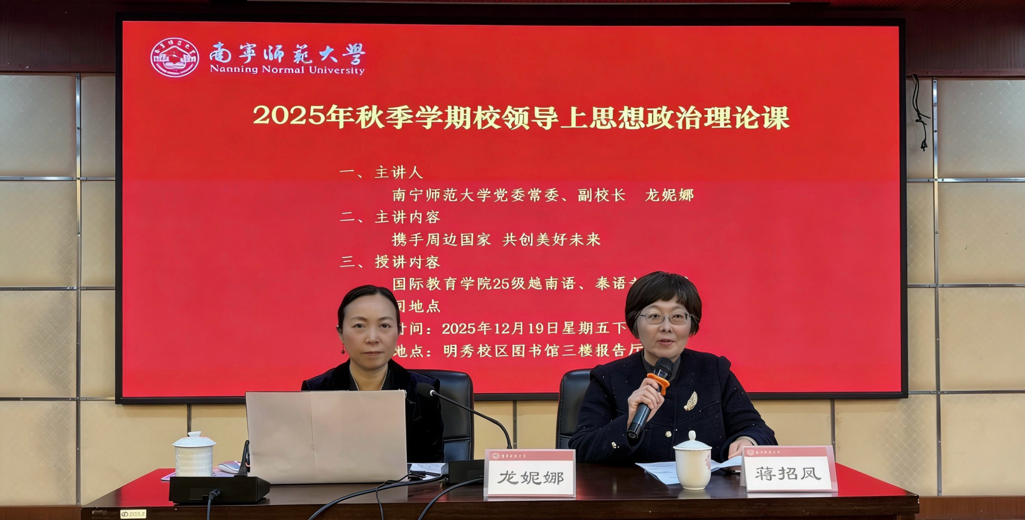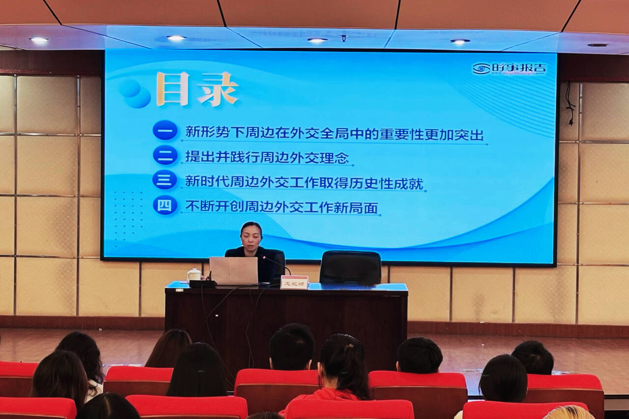 12月19日下午,学校副校长龙妮娜以《携手周边国家 共创美好未来》为题,在明秀校区图书馆报告厅为国际教育学院2025级越南语、泰语专业学生讲授《形势与政策》课。