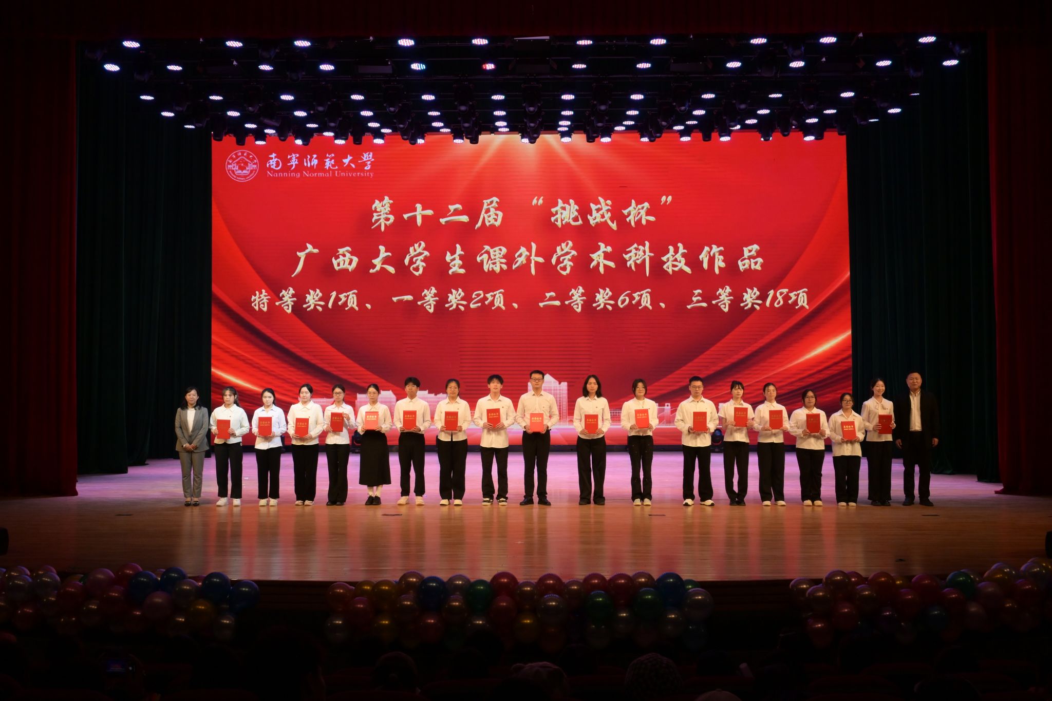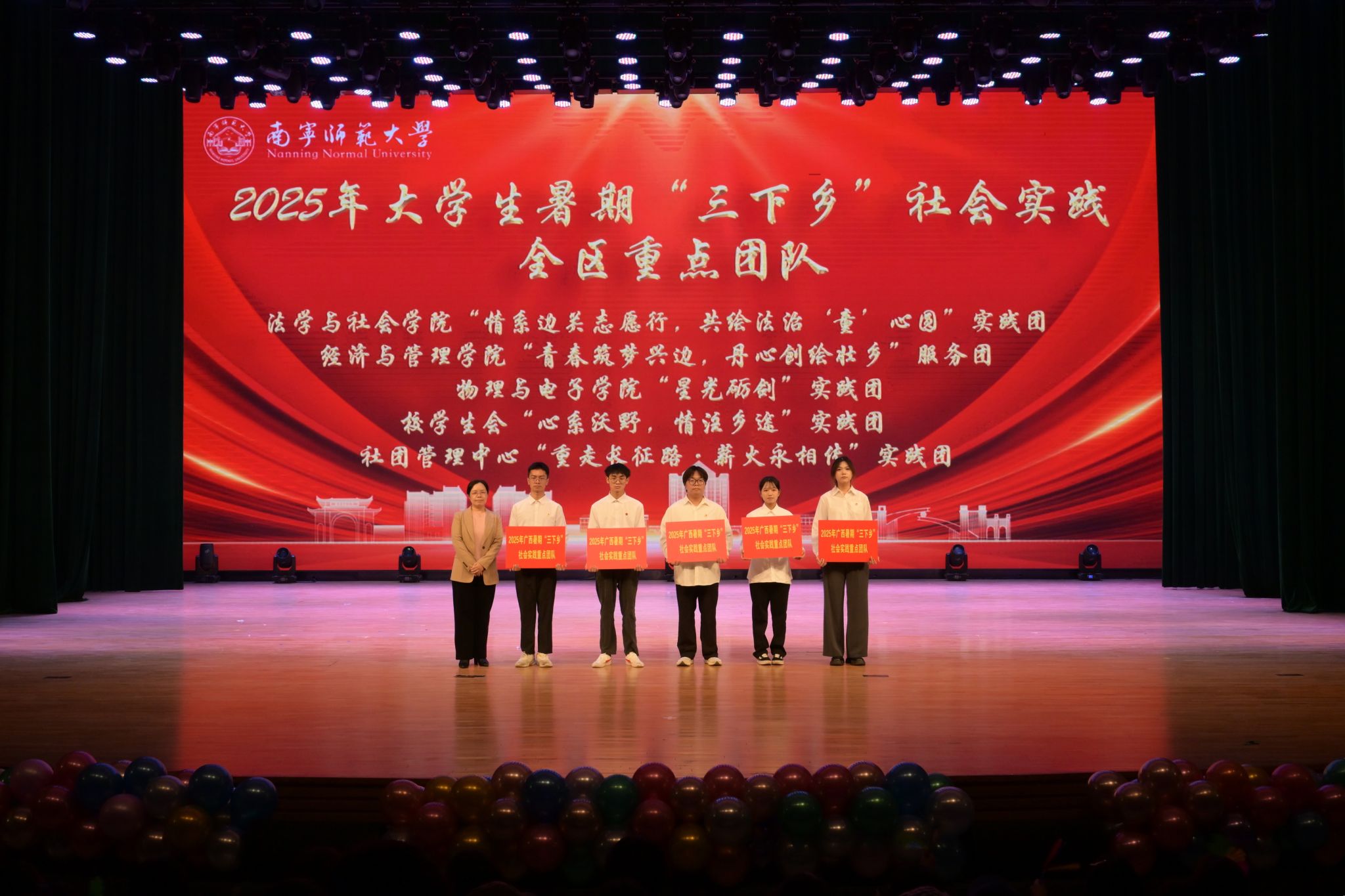 随后,表彰学校2025年暑期“三下乡”社会实践活动优秀团队、先进个人、优秀指导教师以及全国、全区专项团队,颁发全国、全区“挑战杯”大学生课外学术科技作品竞赛荣誉奖项,校领导及相关部门负责人为获奖代表颁发了荣誉牌匾和证书。体育与健康学院团委书记农梦莲、物理与电子学院巫素莲同学作为师生代表发言,分别分享了实践的育人感悟与投身科创的探索历程,传递青春奋斗力量。