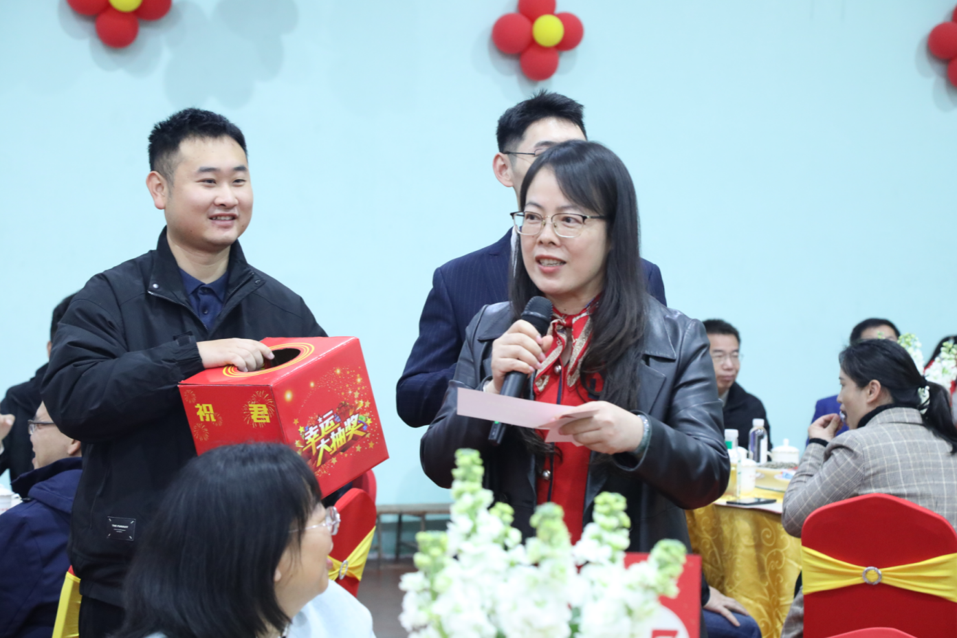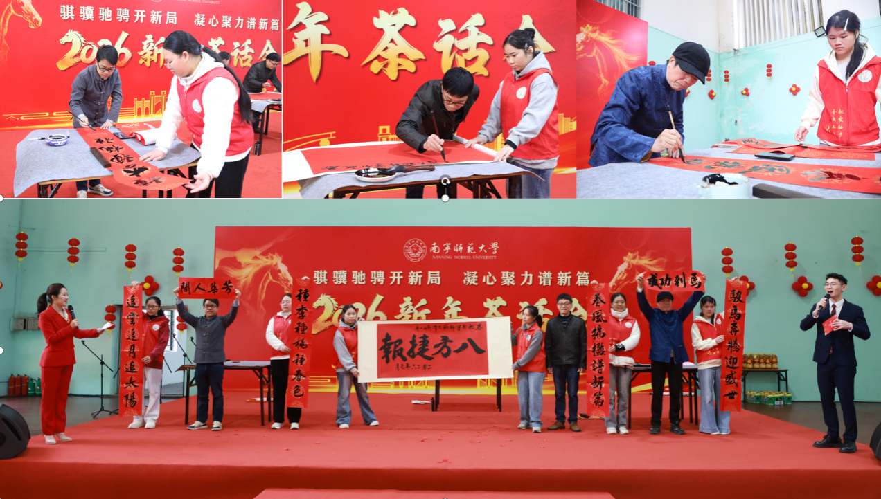 茶话会期间,师生代表表演了歌曲、朗诵、舞蹈、书法等精彩节目,展现学校蓬勃向上的精神风貌,凝聚了团结奋进的磅礴力量。音乐与舞蹈学院教师龙榕宇、刘俊纬带来男女对唱《春风十万里》奏响前行号角,文学院教师王毅、朱冬夏、刘基伟、陈亚飞深情朗诵《春风与荣光——致best365足球官网的明天》,音乐与舞蹈学院齐晨雨带来国风拉丁《西楼别序》,来自国际教育学院的佳音(印度)、张林金(老挝)、云苏锦(柬埔寨)、李辉(泰国)等留学生代表用流利中文朗诵《中国话》,音乐与舞蹈学院舒春秀老师独唱《祖国你好》,来自离退休教职工服务中心、初等教育学院的张巧平、管义怀、钟勇等老师书法展示《春联送福》送上美好祝愿。离退休老同志还亲笔书写了百余张福字,将满满的祝福送到现场参会人员手中。互动抽奖环节更是将现场气氛推向高潮,精选自帮扶乡村的特色礼品让大家收获了满满的惊喜与欢乐。