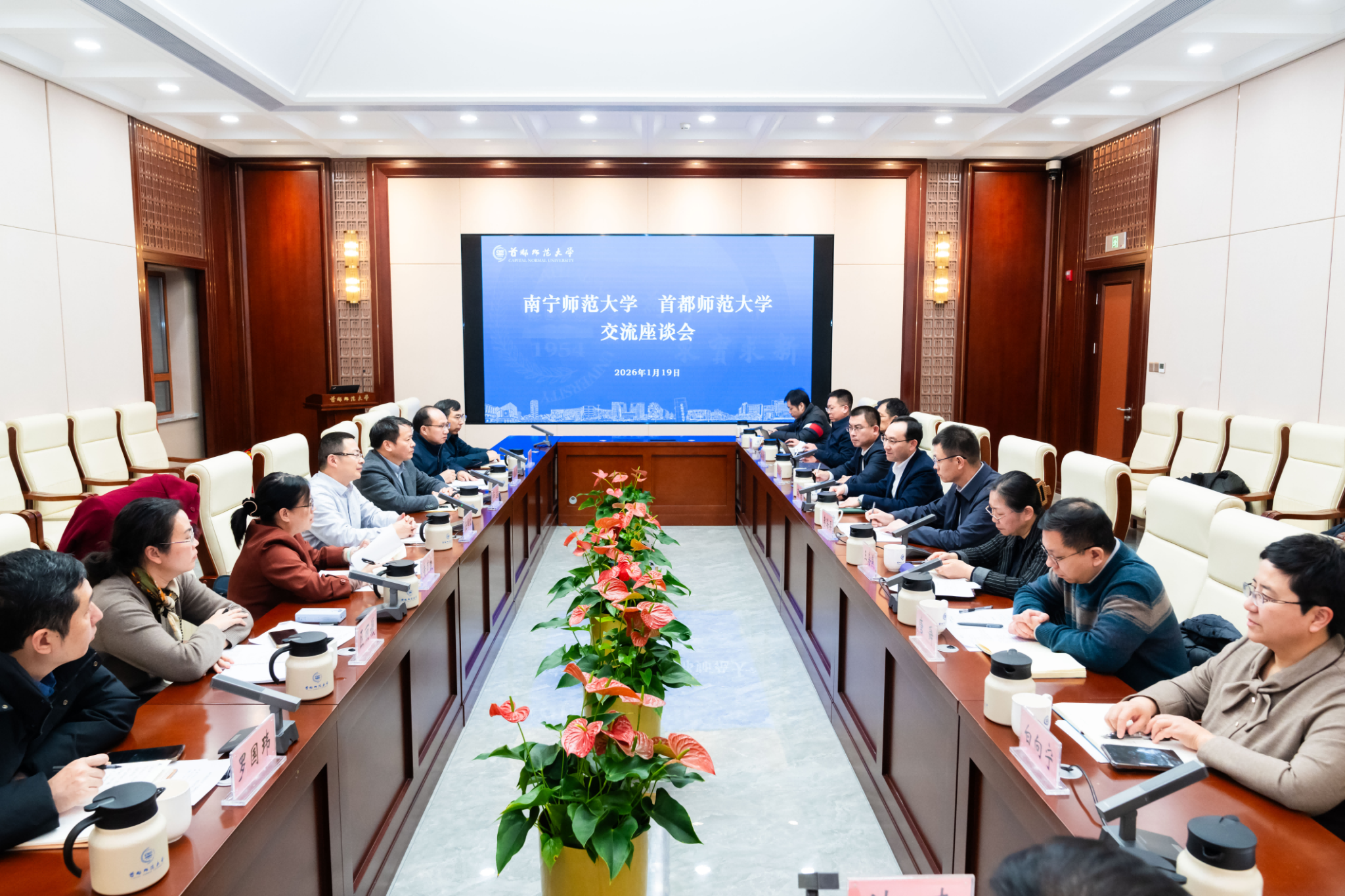 调研组首站抵达首都师范大学。首都师范大学副校长蔡春、李海梁、王洛忠对best365官网调研组的到来表示热烈欢迎,蔡春介绍了首都师范大学的发展历程与优势特色,指出两校同为地方师范院校,专业特色鲜明,希望进一步深化合作交流,为双方改革注入新动能。王国红对首都师范大学的周密安排表示感谢,并介绍了best365官网的办学历史和发展成就,提出best365官网与首都师范大学在发展理念与实践路径上存在诸多契合点,希望以此次交流为契机,持续深化多领域合作,共同推动学校事业高质量发展。双方围绕管理体制与博士点建设,高水平科研平台建设与有组织科研工作,学科交叉融合与人工智能赋能等新兴专业建设,教学改革与人才培养创新,社会服务、国内合作、校友和基金会工作等内容开展交流探讨。座谈会前,调研组一行参观了首都师范大学校史馆。